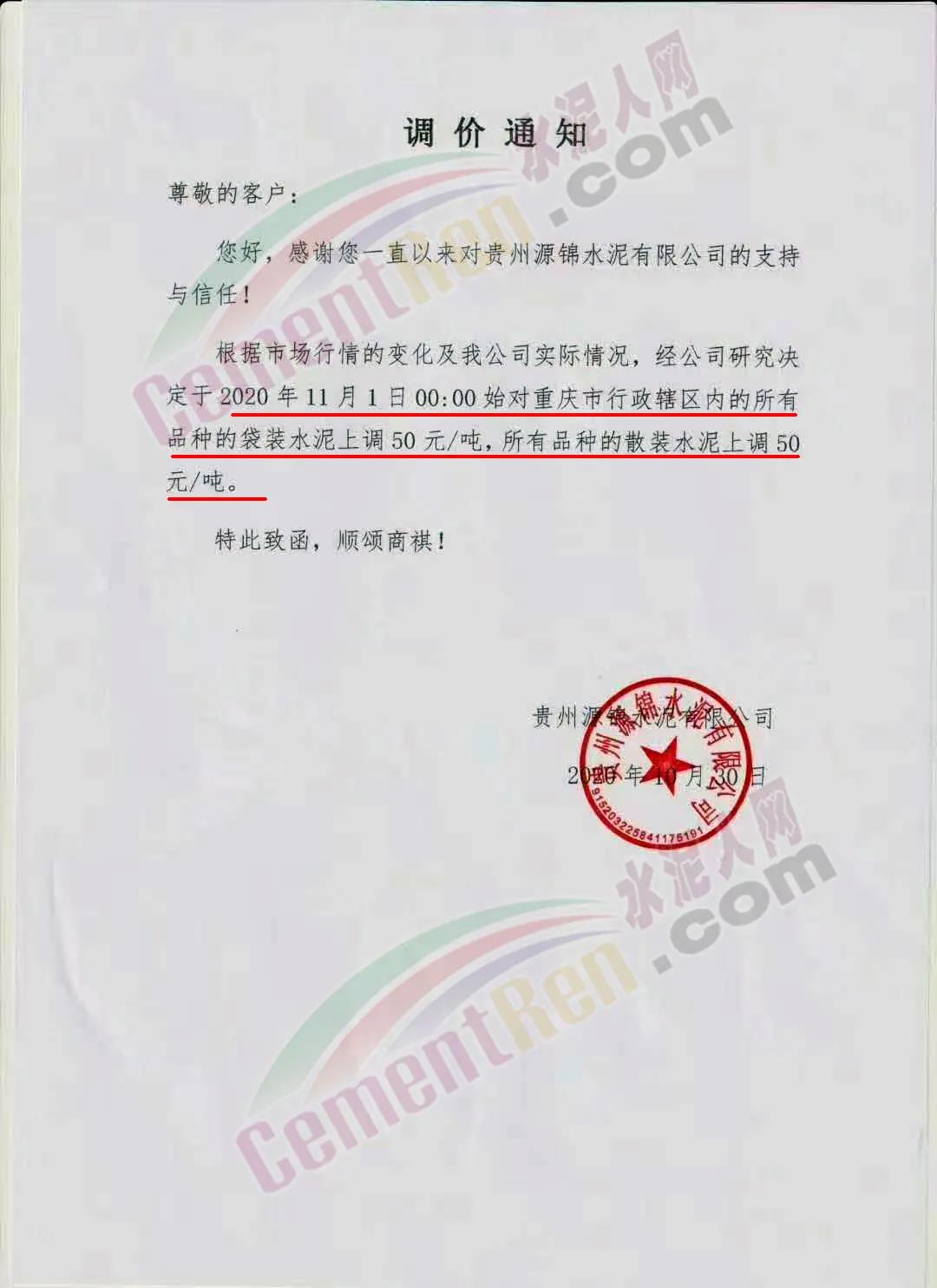 貴州源錦水泥通知,根據(jù)市場行情的變化及公司實(shí)際情況,經(jīng)公司研究決定于11月1日0時(shí)對(duì)重慶市行政轄區(qū)內(nèi)所有品種的袋裝水泥上調(diào)50元/噸,所有品種的散裝水泥也同步上調(diào)50元/噸。