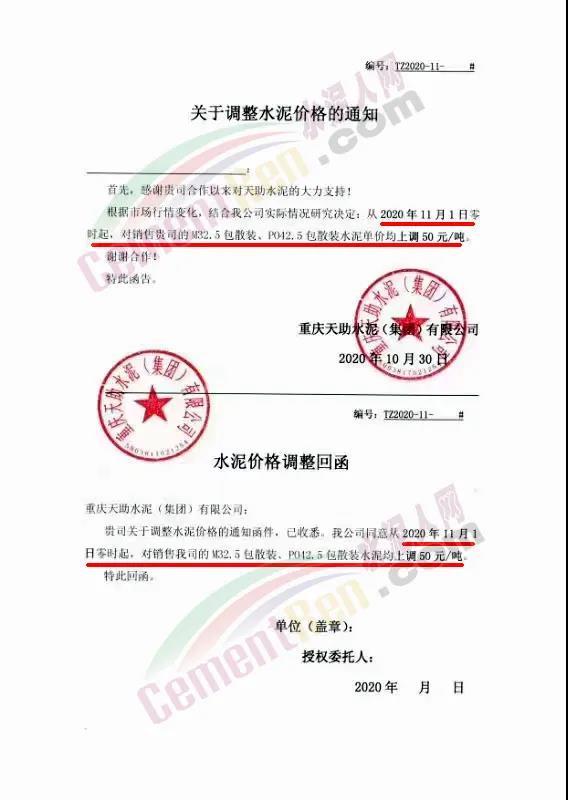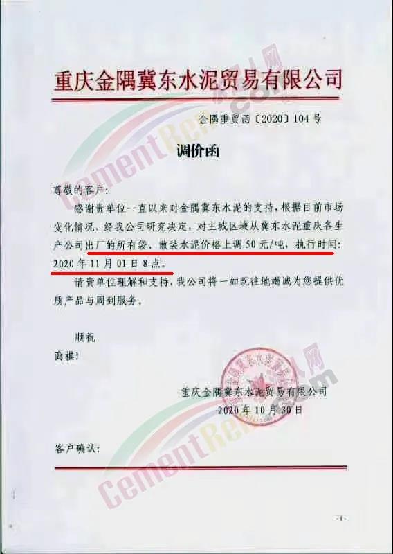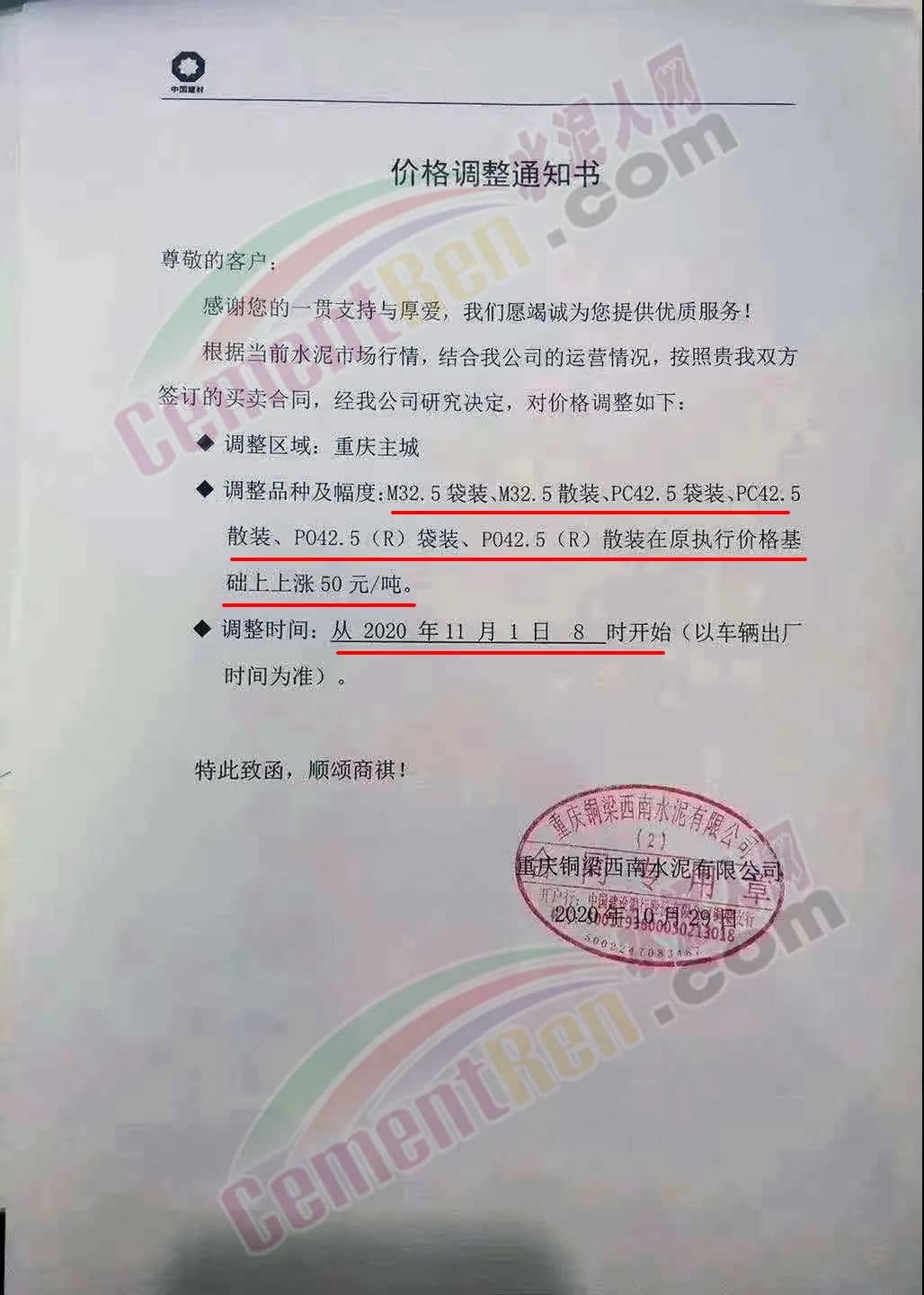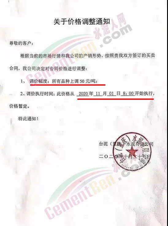 根據(jù)市場情況,經(jīng)研究,決定從2020年11月1日零時(shí)起,本公司發(fā)往福建省內(nèi)各品種各規(guī)格型號(hào)水泥在原價(jià)格基礎(chǔ)上上調(diào)30元/噸。