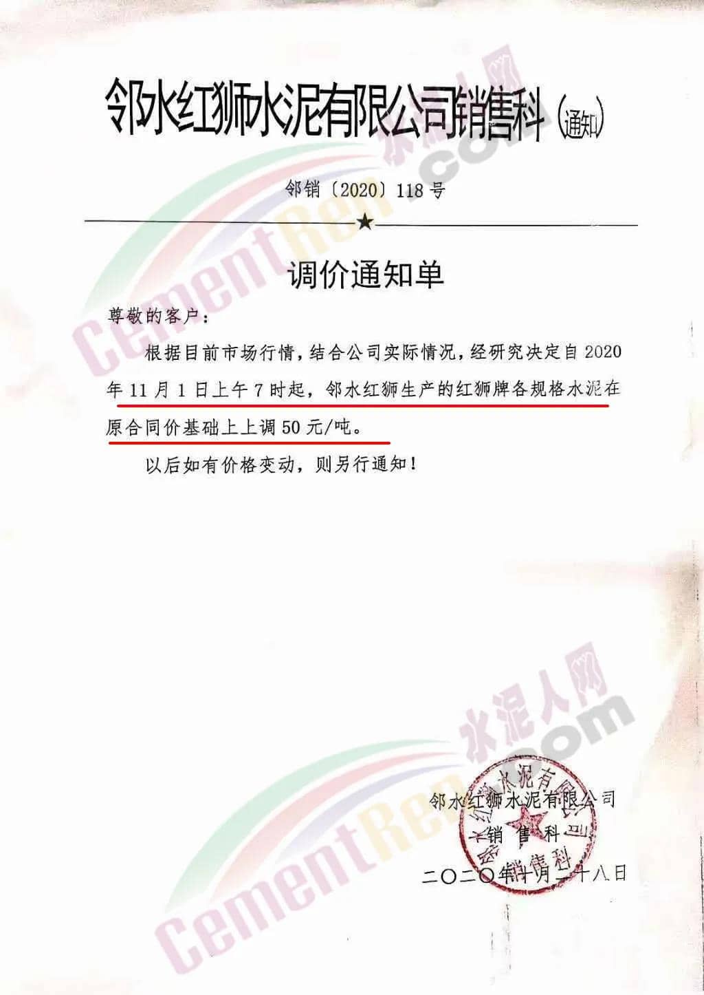 鄰水紅獅水泥銷售科通知自11月1日早7時(shí)起,鄰水紅獅生產(chǎn)的紅獅牌各規(guī)格水泥在原合同價(jià)基礎(chǔ)上上調(diào)50元/噸。