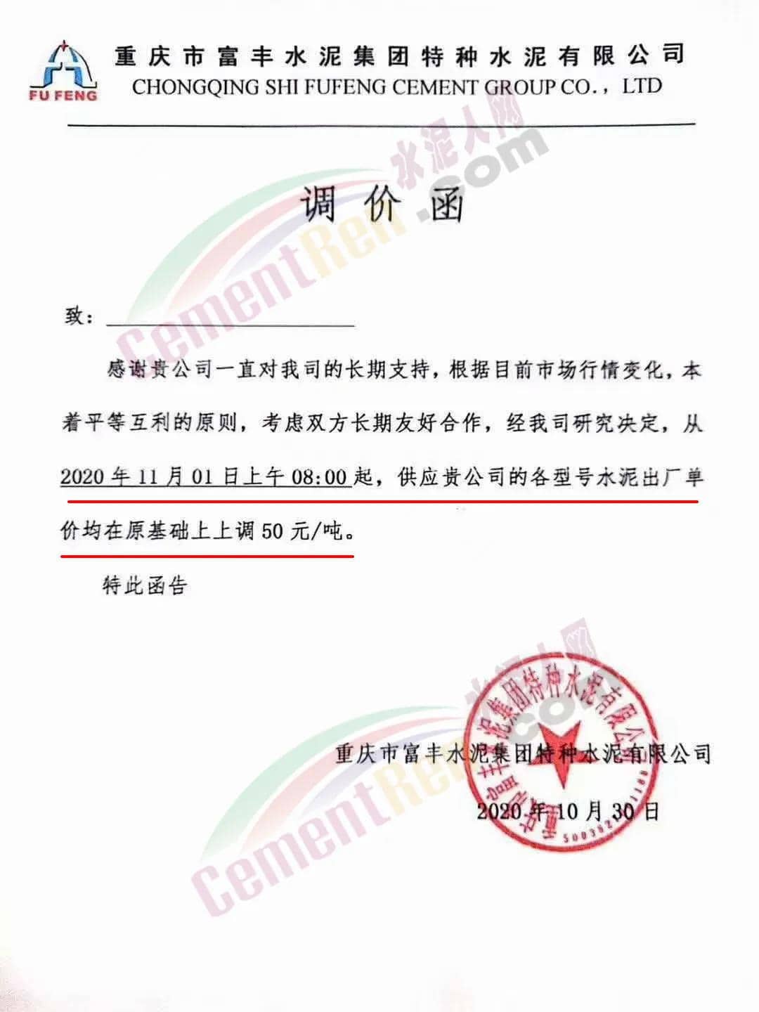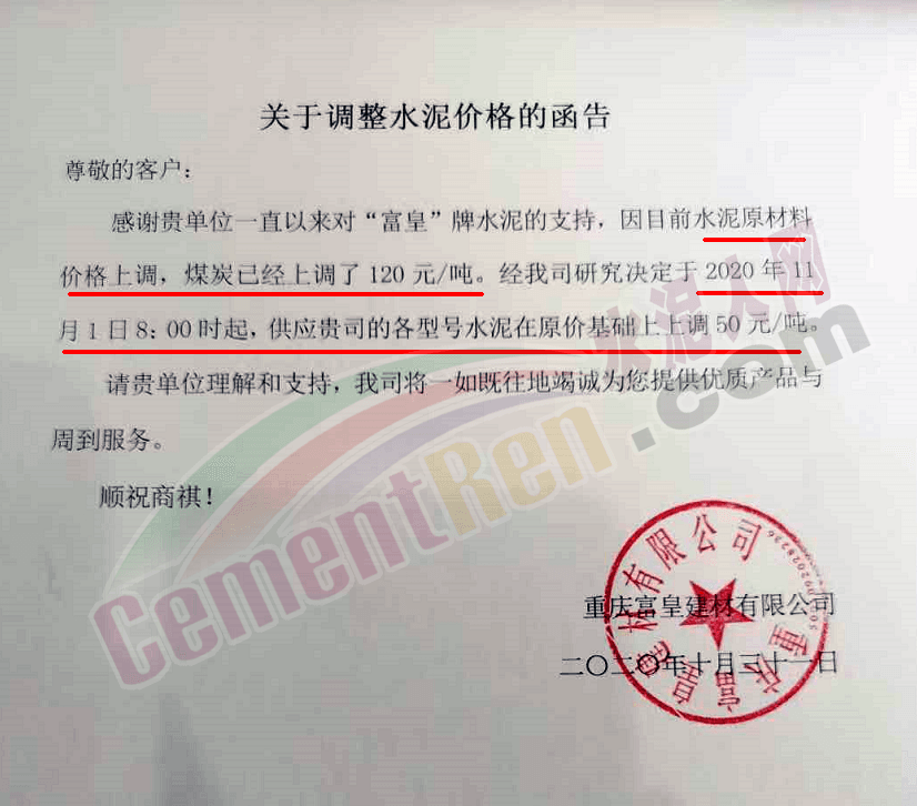 重慶富皇建材有限公司通知,因水泥原材料價(jià)格上漲,煤炭已經(jīng)上調(diào)120元/噸,公司決定于11月1日8時(shí)起,上調(diào)“富皇”水泥各標(biāo)號(hào)價(jià)格50元/噸。