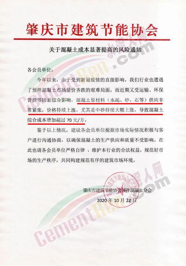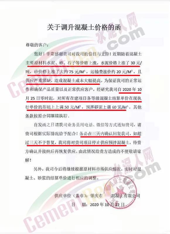 肇慶某混凝土公司發(fā)函通知稱,近期隨著混凝土主要原材料水泥、砂、石子等價(jià)格上漲,水泥價(jià)格上漲了30元/噸,砂價(jià)格上漲了大約75元/m³,運(yùn)輸費(fèi)漲價(jià)約20元/m³,且供應(yīng)嚴(yán)重緊缺,造成混凝土成本大幅提高,為保證公司的正常運(yùn)作和確保產(chǎn)品質(zhì)量以及正常供應(yīng)客戶,經(jīng)研究公司自2020年10 月25日零時(shí)起,對(duì)所有在建項(xiàng)目各等級(jí)混凝土結(jié)算單價(jià)在現(xiàn)執(zhí)行單價(jià)的基礎(chǔ)上上調(diào)50元/m³,預(yù)拌砂漿上調(diào)60元/m³,其他條款按原合同繼續(xù)執(zhí)行。