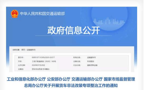 按照國務院安委會《全國安全生產專項整治三年行動計劃》(以下簡稱《行動計劃》)部署和《道路運輸安全專項整治三年行動實施方案》(以下簡稱《實施方案》)要求,工業和信息化部、公安部、交通運輸部、市場監管總局決定自2020年7月至2021年5月組織開展貨車非法改裝專項整治工作,預防和遏制貨車非法改裝行為,保障道路運輸安全。具體事項通知如下。