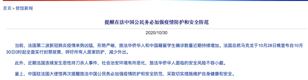 10月30日,中國駐法國大使館發(fā)布消息,再次提醒旅法中國公民務必加強疫情防護和安全防范,采取切實措施維護自身健康和安全。