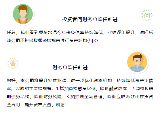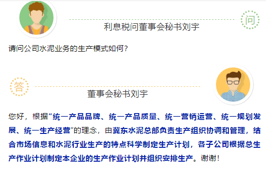 5.成本優勢:公司持續做實做優生產運營管控,為實現高質量發展,持續推進“培優”工作,以培優為平臺的對標、總結、互相借鑒、 學習,營造了標桿引領、爭先創優的地良好企業發展氛圍;持續加大技改投入,以篦冷機、預熱器、預粉磨設備等主機提效 為重點加速消除落后工藝、低效裝備;引進、推廣成熟、有效的節能降耗技術措施,降耗能力提升;持續推進直供電工作, 成本控降效果顯著;結合各區域產品質量的差異化需求,按區域制定質量標準,著力解決水泥產品面臨的同質化、低附加值 等重大共性問題,開發適應市場的高性能定制化水泥。使得公司在布局區域的成本競爭優勢明顯,為公司產能釋放、效益提升奠定了基礎。6.人才優勢:公司堅持實施“人才強企”戰略,培養造就了一批綜合素質好的優秀經營管理人才和素質一流的高級專業技術人才隊伍, 建設了一支符合公司發展需要的優秀年輕骨干人才梯隊;通過引進科技領軍人才、高級技術專家等高端優秀人才,匯聚高端智力資源,充分發揮高層次人才在推動公司發展的引領作用。報告期,公司人才結構持續優化、布局更加合理,一批職業素 養好、開拓能力強的經營管理人員成為公司人才競爭的比較優勢。謝謝!
