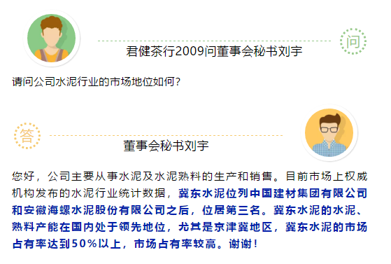 3.環保及環保產業優勢:公司通過前期加大環保投入和后期加快工藝、污染治理設施升級改造,推動環境保護管理五級責任體系建立,繼續全面開展行業內獨創的生態環境標準化建設工作等方式,不斷強化環保內部管控,加強環境監管落實力度,所屬企業污染物排放均符合或優于國家及地方標準,新增國家級“綠色工廠”4家,入圍國家綠色礦山遴選名單14家,著重體現綠色新型環保產品優勢,提升企業可持續健康發展能力。公司以“城市凈化器、政府好幫手”為理念,依托紅樹林公司大力發展環保產業,全力推動符合條件的水泥熟料企業轉型 升級,高速推進京津冀、山西、陜西等12個省市以水泥窯協同處置為主的環保項目建設。水泥窯協同處置技術不斷更新升級, 進一步強化覆蓋41類工業危廢、市政污泥、生活垃圾、飛灰、污染土壤等多方面的綜合固廢處置能力。同時,參與包括《水泥窯協同處置固體廢 物技術規范》(GB30760)、《水泥窯協同處置固體廢 物環境保護技術規范》(HJ662)在內的6項國家、 行業、地方標準的編制,將公司豐富的管理模式、經驗推廣到全行業,奠定公司行業地位的同時,形成了公司在環保產業方 面的獨特優勢。