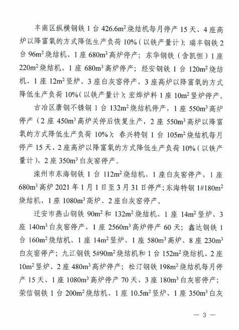 灤州市東海鋼鐵1臺(tái)112m2燒結(jié)機(jī)、1座白灰窯停產(chǎn),1座680m3高爐2021年1月1日至3月31日停產(chǎn);東海特鋼1#180m2燒結(jié)機(jī)、1座1080m2高爐、2座白灰窯停產(chǎn)。