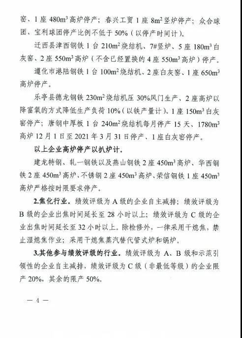 樂亭縣德龍鋼鐵230m2燒結(jié)機(jī)壓30%風(fēng)門生產(chǎn)、2座高爐以降富氧的方式降低生產(chǎn)負(fù)荷10%(以鐵產(chǎn)量計(jì))、1座150m3白灰窯停產(chǎn);唐鋼中厚板1臺(tái)240m2燒結(jié)機(jī)每月停產(chǎn)15天、1780m3高爐12月1日至2021年3月31日停產(chǎn)、1座白灰窯停產(chǎn)。