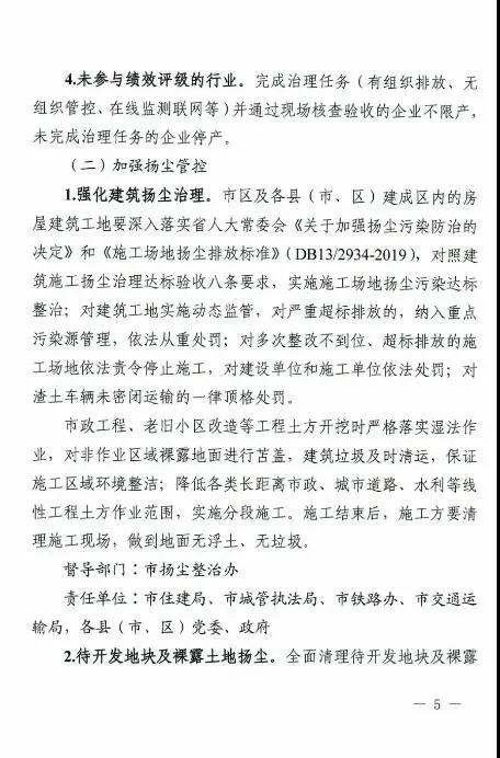 1.強(qiáng)化建筑揚(yáng)塵治理。市區(qū)及各縣(市、區(qū))建成區(qū)內(nèi)的房屋建筑工地要深入落實(shí)省人大常委會(huì)《關(guān)于加強(qiáng)揚(yáng)塵污染防治的決定》和《施工場地?fù)P塵排放標(biāo)準(zhǔn)》(DB13/2934-2019),對照建筑施工揚(yáng)塵治理達(dá)標(biāo)驗(yàn)收八條要求,實(shí)施施工場地?fù)P塵污染達(dá)標(biāo)整治;對建筑工地實(shí)施動(dòng)態(tài)監(jiān)管,對嚴(yán)重超標(biāo)排放的,納入重點(diǎn)污染源管理,依法從重處罰;對多次整改不到位、超標(biāo)排放的施工場地依法責(zé)令停止施工,對建設(shè)單位和施工單位依法處罰;對渣土車輛未密閉運(yùn)輸?shù)囊宦身敻裉幜P。