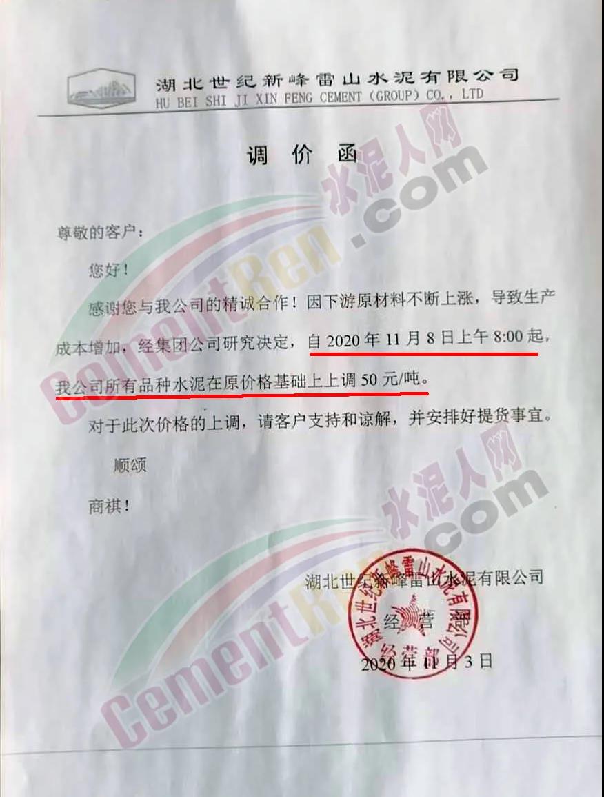 世紀(jì)新峰雷山水泥通知,因原材料不斷上漲,導(dǎo)致生產(chǎn)成本增加,經(jīng)公司研究決定 ,自11月8上午8時(shí)起,公司所有品種水泥在原價(jià)格基礎(chǔ)上上調(diào)50元/噸。