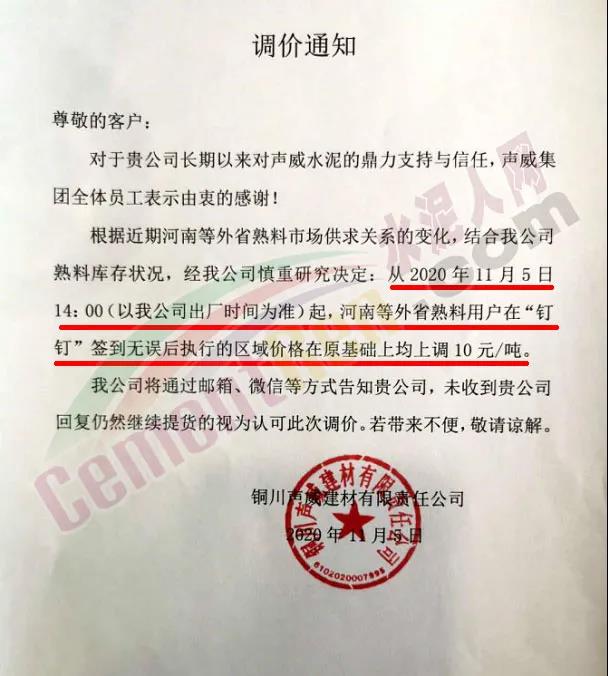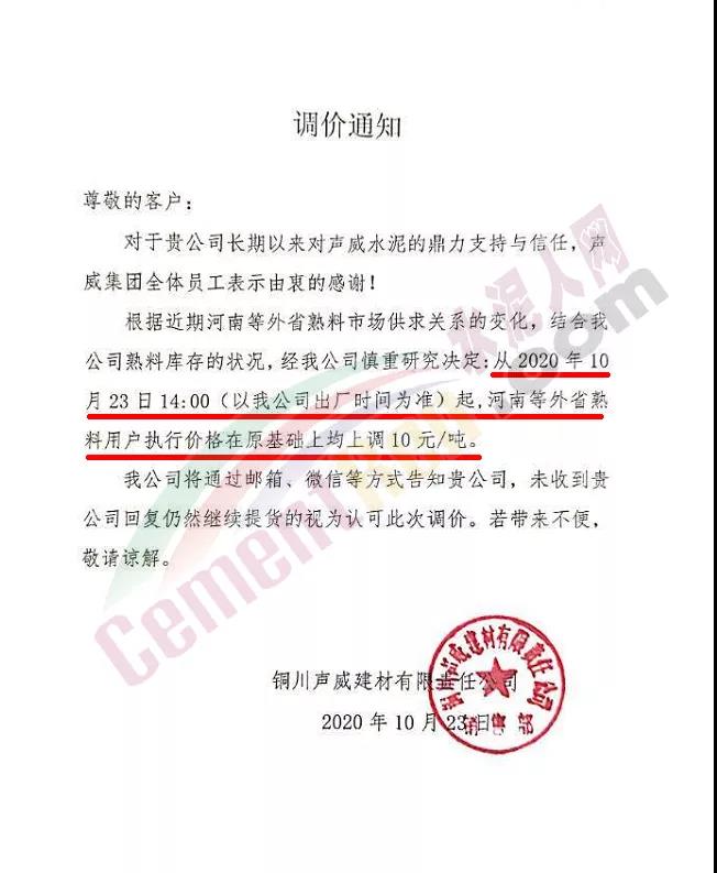 據(jù)水泥人網(wǎng)了解,10月23日陜西銅川聲威建材有限公司也曾發(fā)通知對(duì)河南等外省熟料用戶執(zhí)行價(jià)格在原基礎(chǔ)上上調(diào)10元/噸。