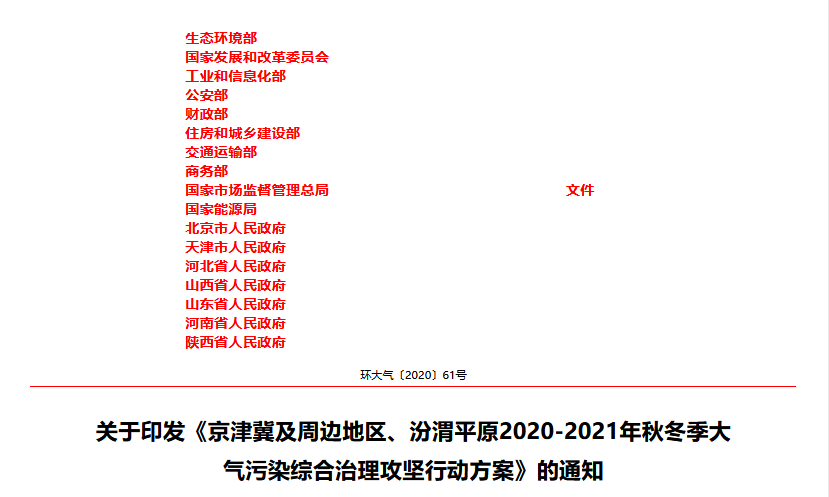 生態環境部 發展改革委工業和信息化部 公安部財政部 住房城鄉建設部交通運輸部 商務部市場監管總局 能源局北京市人民政府 天津市人民政府河北省人民政府 山西省人民政府山東省人民政府 河南省人民政府陜西省人民政府2020年10月28日(此件社會公開)京津冀及周邊地區、汾渭平原