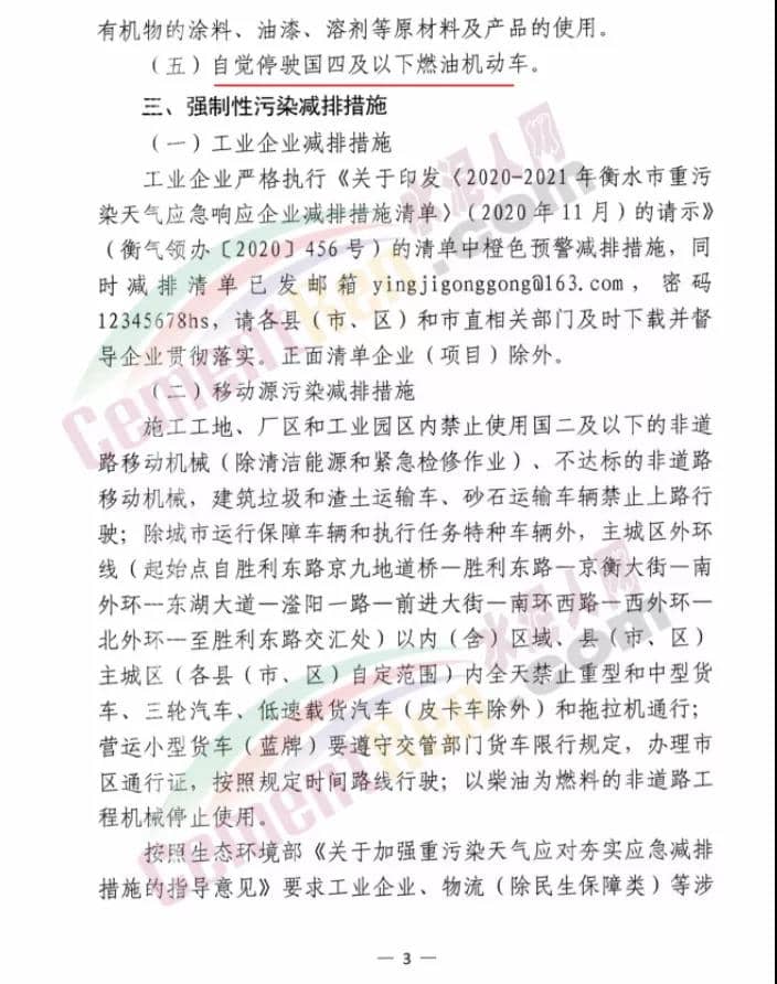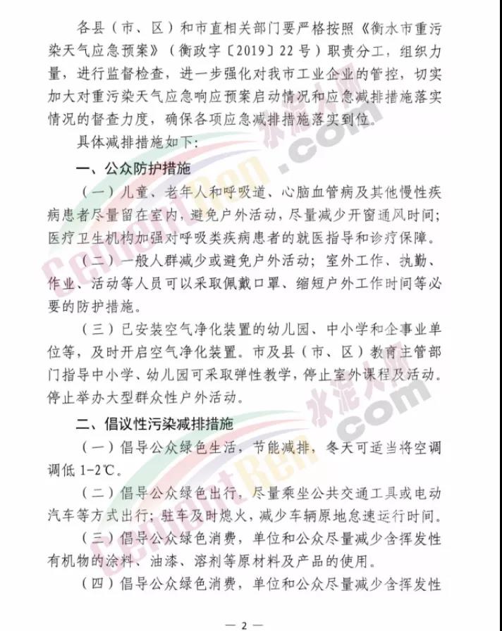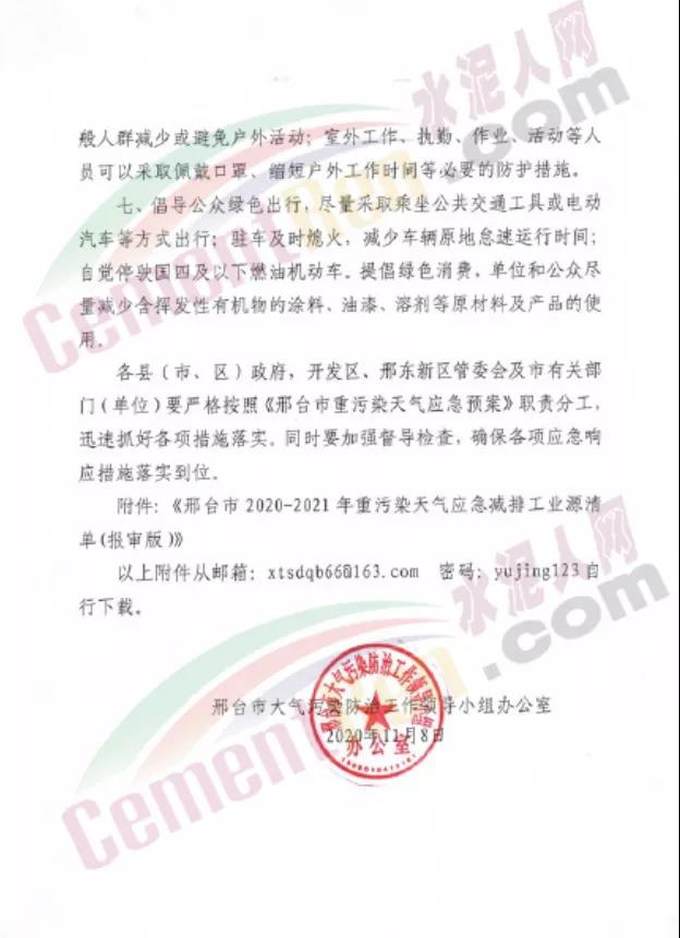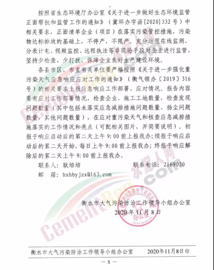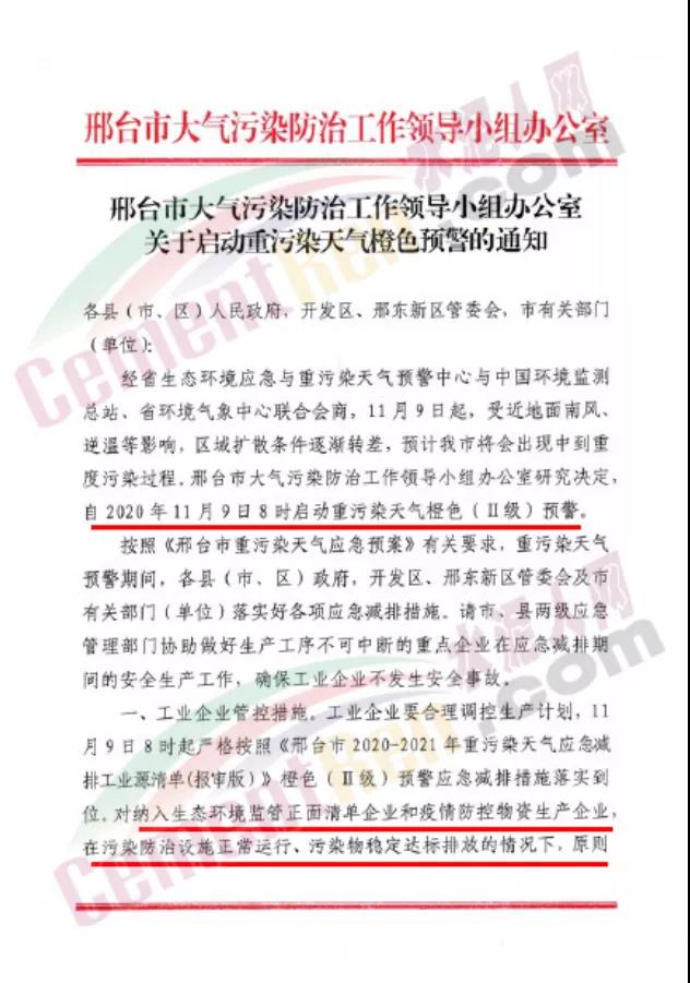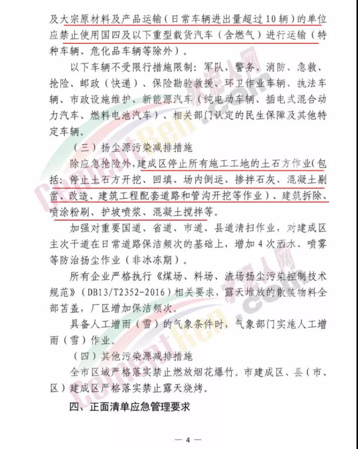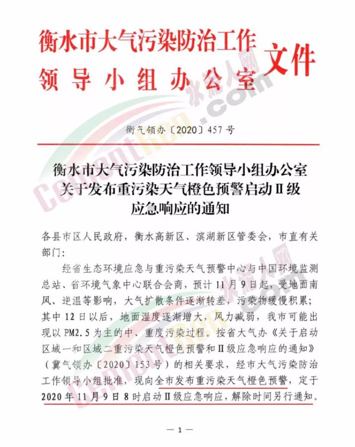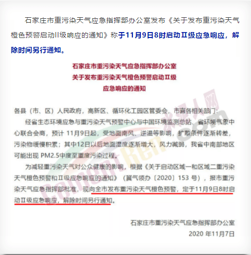 衡水市大氣污染防治工作領導小組辦公室發文:定于2020年11月9日8時啟動Ⅱ級應急響應,解除時間另行通知。工業企業嚴格按照《2020-2021年衡水市工業企業應急減排清單(報審版)》的清單中橙色預警減排措施執行。除應急搶險外,建成區停止所有施工工地的土石方作業(包括:停止土石方開挖、回填、場內倒運、摻拌石灰、混凝土剔鑿、改造、建筑工程配套道路和管溝開挖等作業)、建筑拆除、噴涂粉刷、護坡噴漿、混凝土攪拌等。