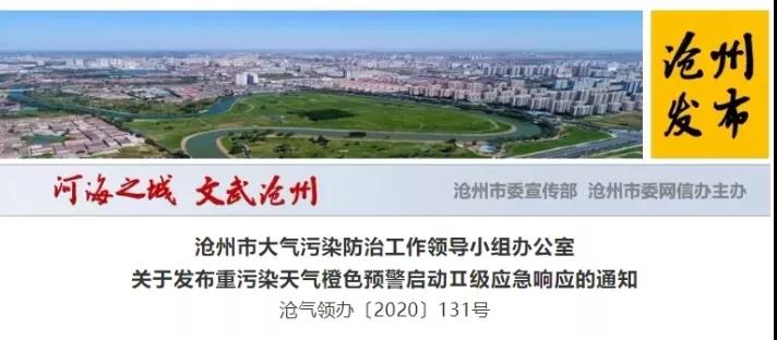 滄州市大氣污染防治工作領導小組辦公室通知于11月9日8時發布重污染天氣橙色預警,啟動Ⅱ級應急響應,解除時間另行通知。