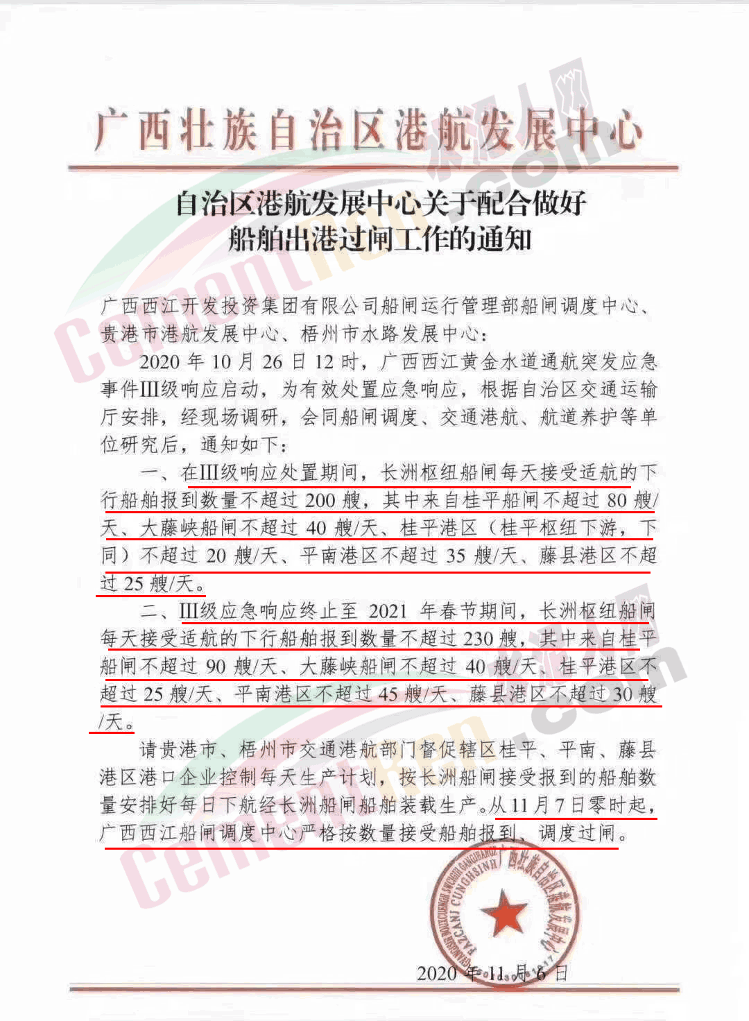 日前,廣西壯族自治區(qū)港航發(fā)展中心發(fā)布《自治區(qū)港航發(fā)展中心關于配合做好船舶出港過閘工作的通知》稱,2020年10月26日12時,廣西西江黃金水道通航突發(fā)應急事件Ⅲ級響應啟動,為有效處置應急響應,根據(jù)自治區(qū)交通運輸廳安排,經(jīng)現(xiàn)場調研,會同船閘調度、交通港航、航道養(yǎng)護等單位研究后,要求在Ⅲ級響應處置期間,長洲樞紐船閘每天接受適航的下行船舶報到數(shù)量不超過200艘,其中來自桂平船閘不超過80艘/天、大藤峽船閘不超過40艘/天、桂平港區(qū)(桂平樞紐下游,下同)不超過 20艘/天、平南港區(qū)不超過35艘/天、藤縣港區(qū)不超過25艘/天。二、Ⅲ級應急響應終止至 2021年春節(jié)期間,長洲樞紐船閘每天接受適航的下行船舶報到數(shù)量不超過230艘,其中來自桂平船閘不超過 90艘/天、大藤峽船閘不超過40艘/天、桂平港區(qū)不超過25艘/天、平南港區(qū)不超過45艘/天、藤縣港區(qū)不超過30艘/天。請貴港市、梧州市交通港航部門督促轄區(qū)桂平、平南、藤縣港區(qū)港口企業(yè)控制每天生產(chǎn)計劃,按長洲船閘接受報到的船舶數(shù)量安排好每日下航經(jīng)長洲船閘船舶裝載生產(chǎn)。從11月7日零時起,廣西西江船閘調度中心嚴格按數(shù)量接受船舶報到、調度過閘。