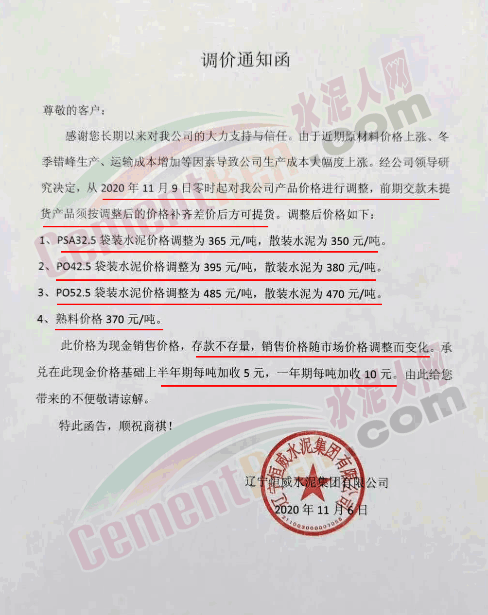 遼寧恒威水泥集團調價通知稱,由于近期原材料價格上漲、冬季錯峰生產(chǎn)、運輸成本增加等因素導致公司生產(chǎn)成本大幅度上漲。經(jīng)公司領導研究決定,從2020年11月9日零時起對公司產(chǎn)品價格進行調整,前期交款未提貨產(chǎn)品須按調整后的價格補齊差價后方可提貨。調整后價格如下∶1、PSA32.5袋裝水泥價格調整為365元/噸,散裝水泥為350元/噸。2、PO42.5袋裝水泥價格調整為395元/噸,散裝水泥為380元/噸。3、PO52.5袋裝水泥價格調整為485元/噸,散裝水泥為470元/噸。4、熟料價格370元/噸。此價格為現(xiàn)金銷售價格,存款不存量,銷售價格隨市場價格調整而變化。承兌在此現(xiàn)金價格基礎上半年期每噸加收5元,一年期每噸加收10元。