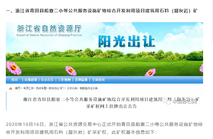 2020年10月29日,浙江省自然資源公共交易中心正式開拍新昌境外并購產業合作園中小微企業園(二期)建設項目新昌縣羽林街道大塘坑村樟樹腳建筑石料用玄武巖礦采礦權,此礦權基本信息如下: