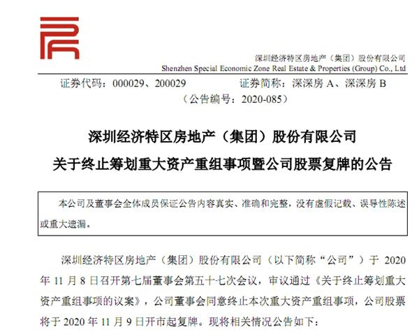 7.6萬股民苦等1500多天后,恒大終止“借殼”據(jù)了解,2016年10月3日,恒大地產(chǎn)與深深房簽署《關(guān)于重組上市的合作協(xié)議》,深深房以發(fā)行A股股份及或支付現(xiàn)金的方式購買恒大地產(chǎn)100%股權(quán)。交易完成后,恒大地產(chǎn)將實(shí)現(xiàn)A股上市。不過此后至今,雙方多次調(diào)整排他期和有效期,直至8日宣布終止重組。深深房也將于9日復(fù)牌交易。深深房A自2016年9月14日開市起停牌,讓大多數(shù)深深房A投資者沒有想到的是,這一停就是4年多,累計(jì)停牌時(shí)間逾1500天。據(jù)悉,此案創(chuàng)下中國(guó)股市房企重組停牌之最長(zhǎng)時(shí)間記錄,這期間7.6萬股民陪著深深房一起進(jìn)行了漫長(zhǎng)的等待,到頭來啥也沒撈著。