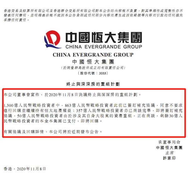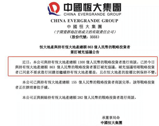 此前在9月24日,網(wǎng)上流傳出一份恒大集團(tuán)的文件,稱若無法按時(shí)回A,中國(guó)恒大的資金鏈可能斷裂,“可能引發(fā)一系列系統(tǒng)性風(fēng)險(xiǎn)”,因此請(qǐng)求政府施以援手。雖然中國(guó)恒大隨后否認(rèn)該文件的真實(shí)性,但這份文件依然使恒大連續(xù)兩日上演“股債雙殺”,中國(guó)恒大的資金狀況備受關(guān)注。不過在今年的9月29日,恒大地產(chǎn)與1300億戰(zhàn)投中的863億戰(zhàn)投簽訂補(bǔ)充協(xié)議,戰(zhàn)投同意轉(zhuǎn)為普通股權(quán)長(zhǎng)期持有,且股權(quán)比例保持不變。同時(shí),恒大集團(tuán)還透露已與持有恒大地產(chǎn)總額155億人民幣的戰(zhàn)略投資者商談完畢,該戰(zhàn)略投資者正在辦理審批手續(xù)。正與剩余持有恒大地產(chǎn)總額282億人民幣的戰(zhàn)略投資者進(jìn)行商談。