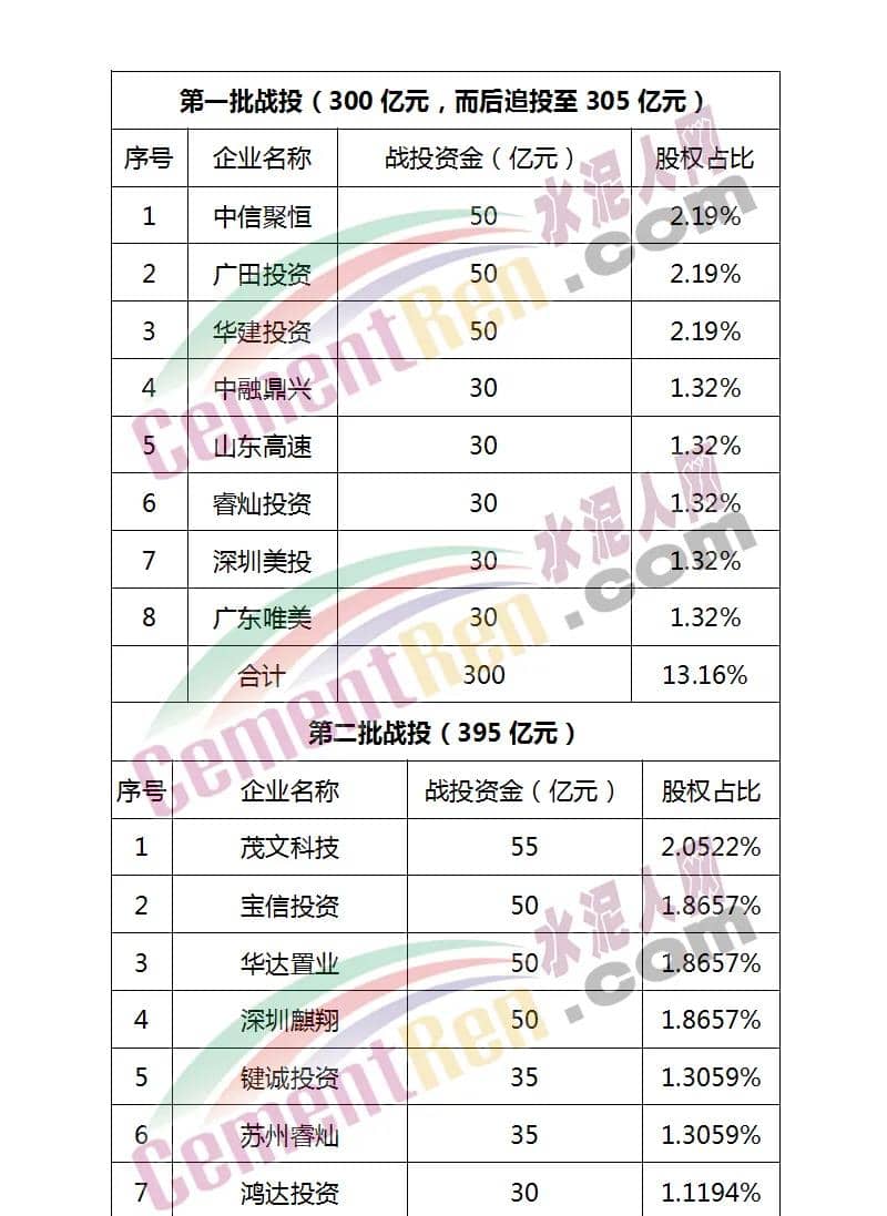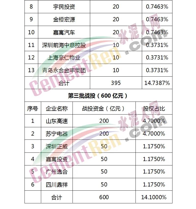 據(jù)水泥人網(wǎng)了解,在引入三輪戰(zhàn)投之后,恒大的控股股東廣東凱隆置業(yè)的股權(quán)攤薄至63.4551%,其中,山東高速共投入230億元,持股比例為5.6652%,蘇寧電器集團(tuán)旗下的南京潤(rùn)恒以200億元入股恒大地產(chǎn),持股比例為4.7038%。三輪增資完成后,投資者合計(jì)向恒大地產(chǎn)投入1300億元資本金,共將獲得恒大地產(chǎn)經(jīng)擴(kuò)大股權(quán)約36.54%權(quán)益,恒大地產(chǎn)總估值提到至4252.3億元。