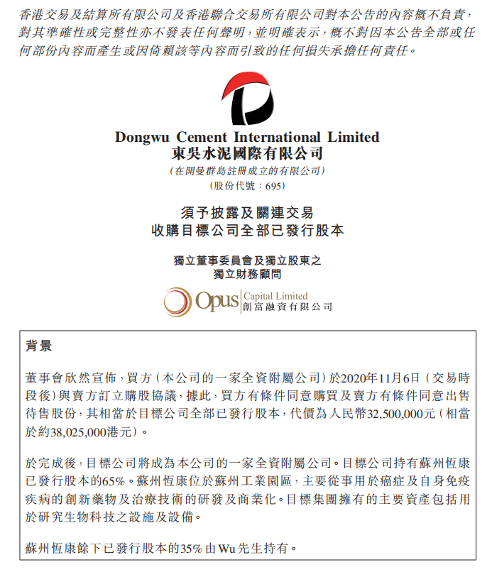 東吳水泥(00695)發布公告,于2020年11月6日,公司全資附屬公司熙華(上海)投資管理有限公司作為買方,擬人民幣3250萬元向賣方東方恒信資本控股集團有限公司購買目標公司(東方恒康生命科學有限公司)全部已發行股本。