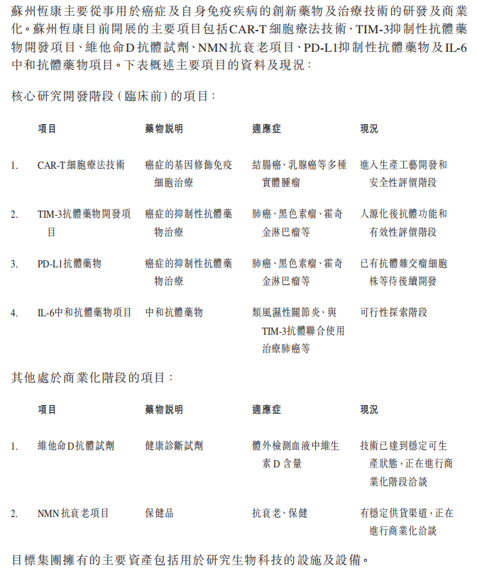 目標集團(目標公司及蘇州恒康)擁有的主要資產包括用于研究生物科技的設施及設備。