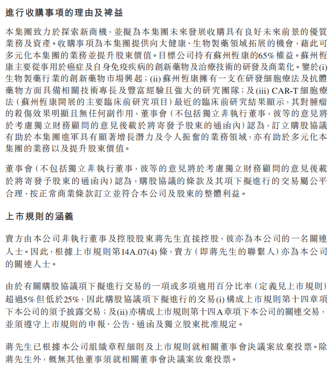 鑒于:生物制藥行業的創新藥物市場興起;蘇州恒康擁有一支在研發細胞療法及抗體藥物方面具備相關技術專長及豐富經驗且強大的研究團隊;及CAR-T 細胞療法(蘇州恒康開展的主要臨床前研究項目)最近的臨床前研究結果顯示,其對腫瘤的殺傷效果明顯且無任何副作用,董事會認為,訂立購股協議有助于集團進軍具有顯著增長潛力及令人振奮的業務領域,亦有助于多元化集團的業務以及提升股東價值。