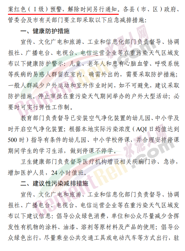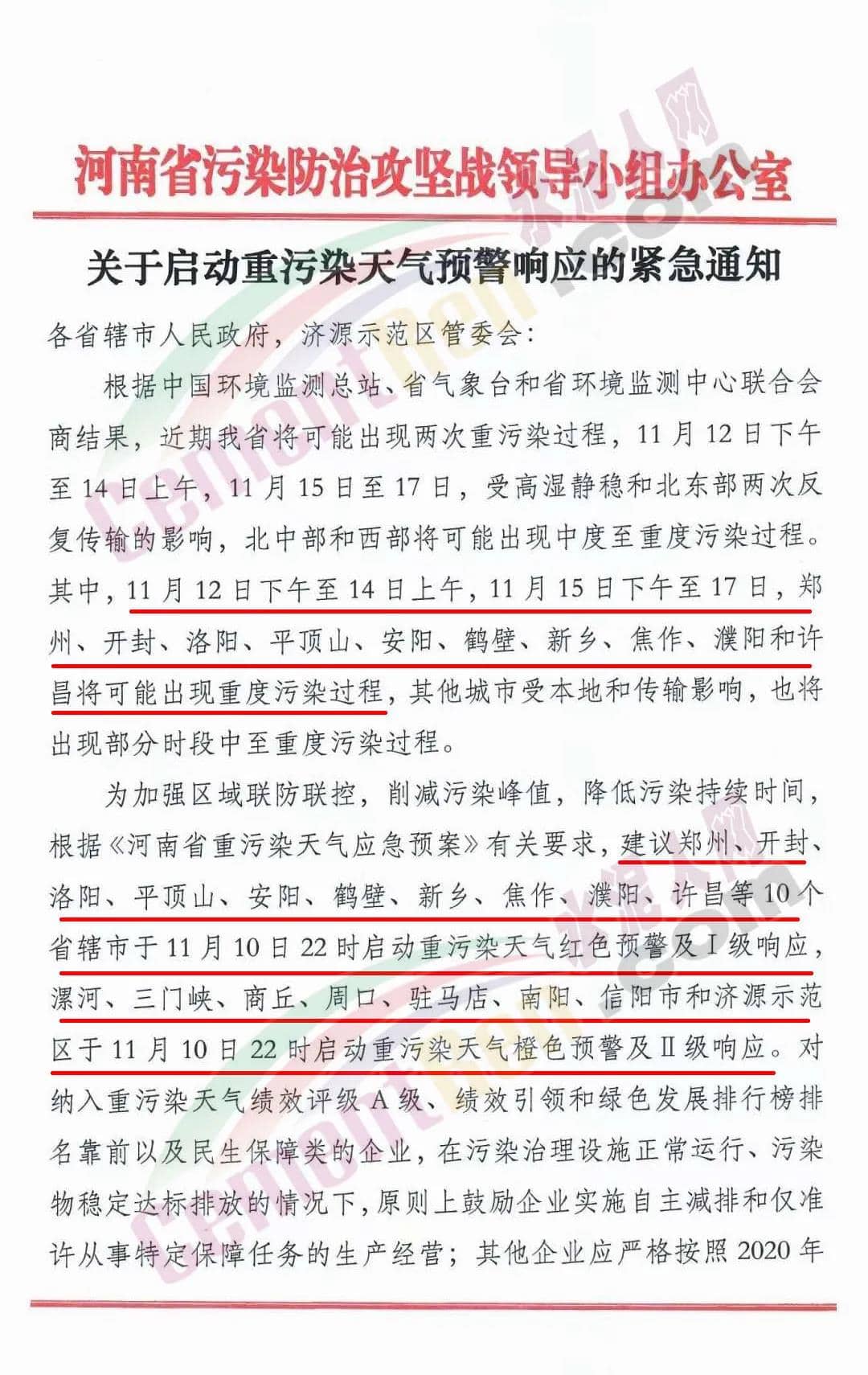 鄭州、開封、 洛陽、平頂山、安陽、鶴壁、新鄉、焦作、濮陽、許昌等10個省轄市于11月10日22時啟動重污染天氣紅色預警及I級響應。漯河、三門峽、商丘、周口、駐馬店、南陽、信陽市和濟源示范區于11月10日22時啟動重污染天氣橙色預警及II級響應。對納入重污染天氣績效評級A級、績效引領和綠色發展排行榜排 名靠前以及民生保障類的企業,在污染治理設施正常運行、污染物穩定達標排放的情況下,原則上鼓勵企業實施自主減排和僅準許從事特定保障任務的生產經營;其他企業應嚴格按照2020年重污染天氣應急減排清單實施相應級別管控措施。應急搶險、重大民生工程和重點項目,在嚴格落實“六個百分之百”施工要求 的前提下,可正常施工。 重污染天氣預警期間,請各地重點加強對城市建成區及周邊排污企業的管控力度,對應停未停、應限不限、預警前故意抬高排放量及用電量,或借“出于安全考慮無法停下來” “設備調試、 檢修”名義規避管控的企業依法依規嚴格處理。各地要主動對社會發聲,提醒公眾做好健康防護措施,倡導公眾低碳生活、綠色消費,單位和公眾盡量減少含揮發性有機物的涂料、油漆、溶劑 等原材料和產品的使用,自覺接受社會監督,同心協力做好重污 染天氣應急應對工作。通知原文如下: