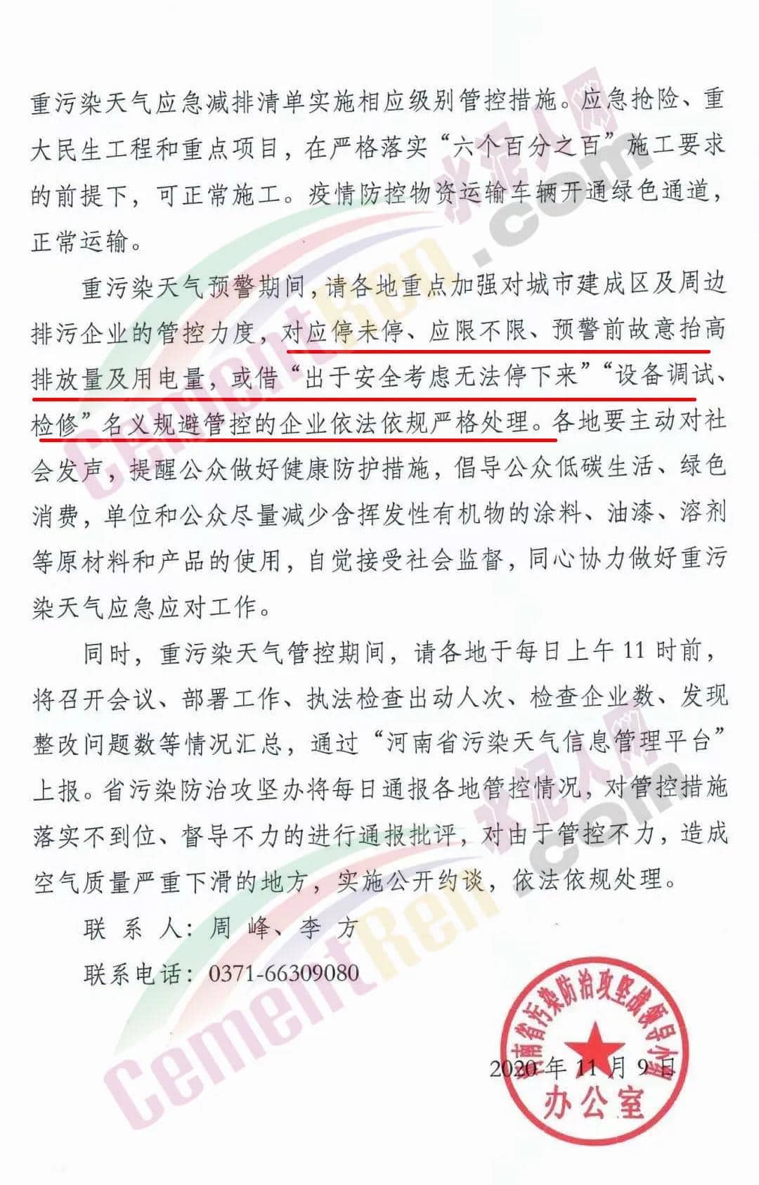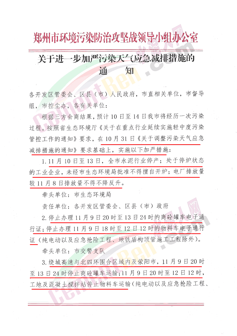 同日,鄭州市環境污染防治攻堅戰領導小組辦公室發布《關于進一步加嚴污染天氣應急減排措施的通知》稱, 按照省生態環境廳《關于在重點行業延續實施輕中度污染管控工作的通知》要求,在10月31日《關于調整污染天氣應急減排措施的通知》要求基礎上,實施加嚴措施: