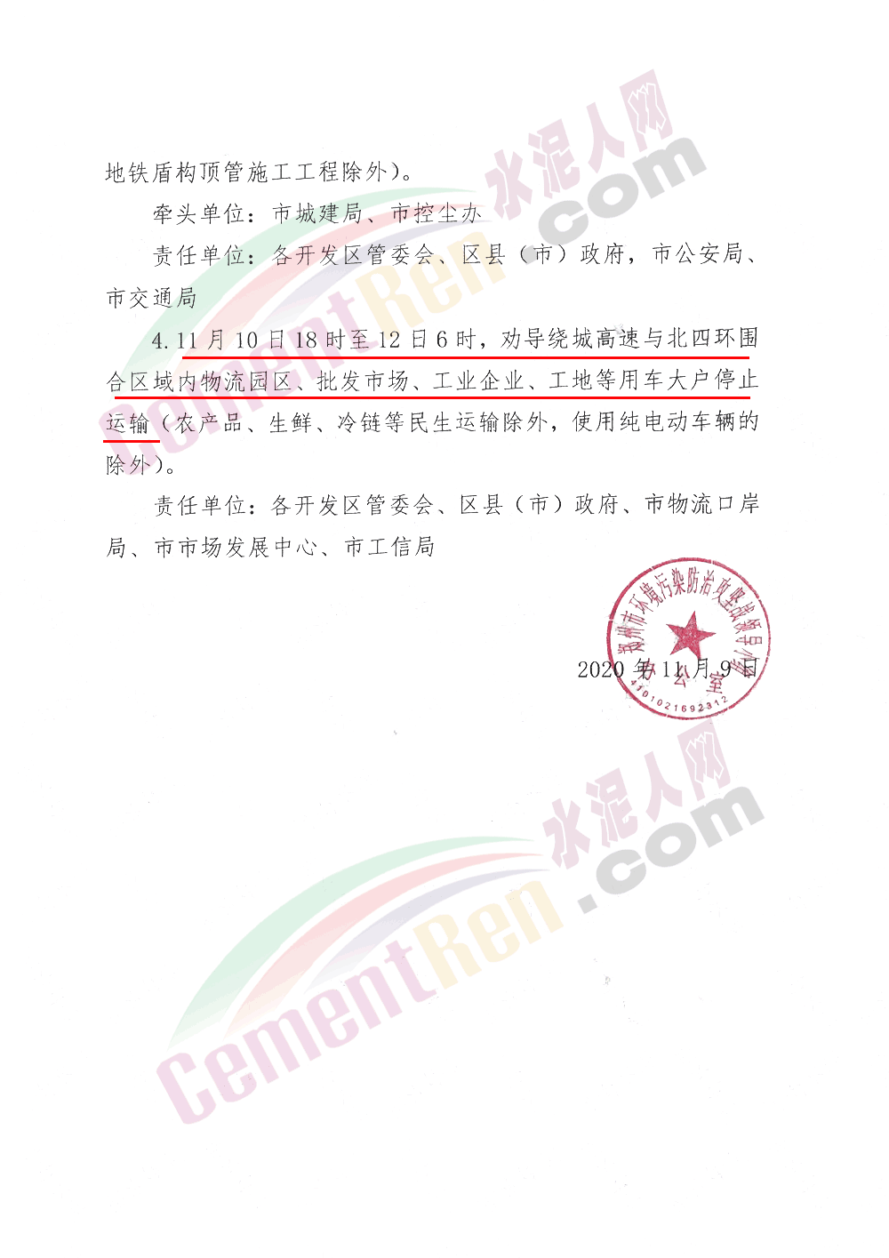 3. 繞城髙速與北四環圍合區域內及滎陽市,11月9日20時至13日24時停止商砼罐車運輸;11月9日20時至12日12時,工地及混凝土攪拌站停止物料車運輸。4