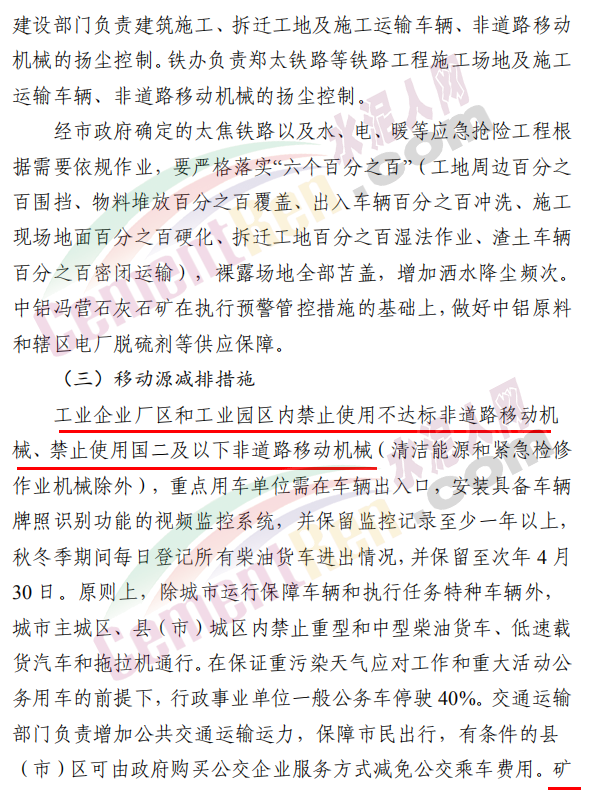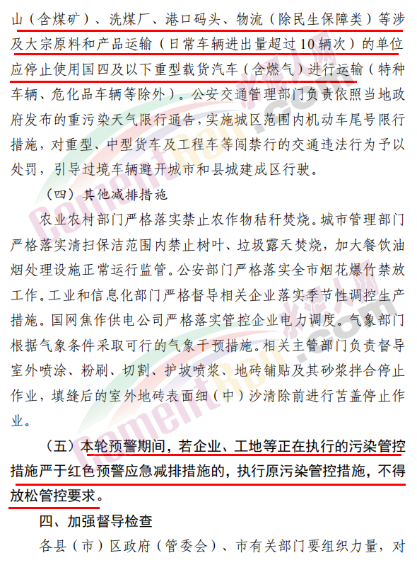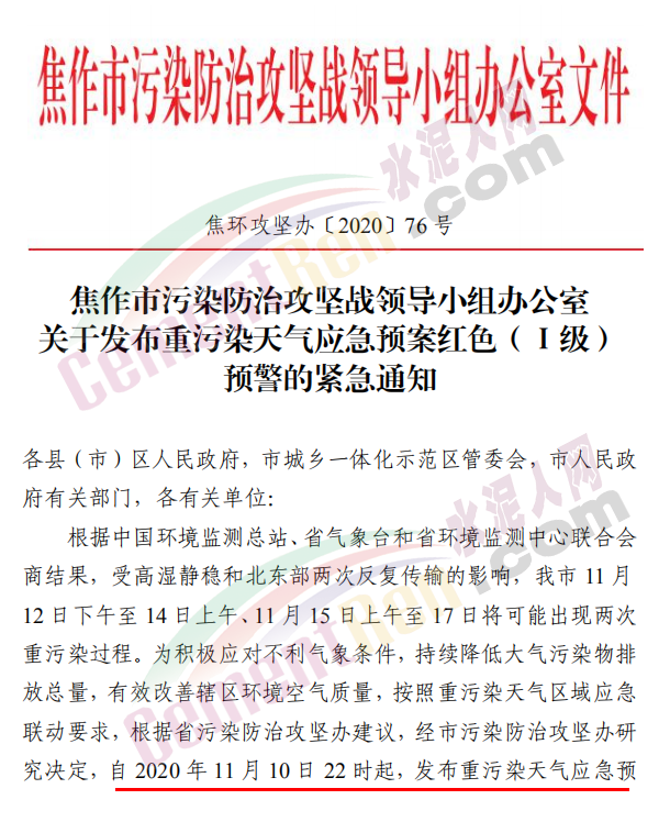 焦作市污染防治攻堅戰領導小組辦公室發布《關于發布重污染天氣應急預案紅色(Ⅰ級)預警的緊急通知》稱,根據省污染防治攻堅辦建議,經焦作市污染防治攻堅辦研究決定,自 2020 年 11 月 10 日 22 時起,發布重污染天氣應急預案紅色(Ⅰ級)預警,解除時間另行通知。各縣(市、區)政府、 管委會及市有關部門要立即采取應急減排措施。工業源減排措施方面要求各縣(市)區人民政府、市城鄉一體化示范區管委會應當按 照重污染天氣預警要求,實施Ⅰ級應急響應,嚴格落實所在轄區2020 年最新修訂的重污染天氣應急減排措施清單中的紅色預警停、限產措施。不可臨時中斷的生產線或生產工序,相關企業應調整生產計劃,確保生產安全運行的前提下,實施最大限度的污染物減排措施。預警期間,嚴禁工業企業新開生產線或運行新的生產設備, 對于重污染天氣績效評級 A 級、績效引領、民生保障等企業, 原則上鼓勵企業自主減排和僅準許特定保障任務的生產經營。長期停產及未建成企業復產或試生產前,須向縣(區)、市兩級污染防治攻堅辦報告,經同意后方可進行。揚塵源減排措施方面要求礦山、砂石料廠、石材廠、石板廠等應停止露天作業;施工工地停止室外作業。建筑垃圾清運車輛和砂石運輸車輛禁止上路行駛。開挖土石方的挖掘機等非道路移動機械停止作業。施工工地內停止使用國二及以下非道路移動機械。移動源減排措施要求工業企業廠區和工業園區內禁止使用不達標非道路移動機械、禁止使用國二及以下非道路移動機械,重點用車單位需在車輛出入口,安裝具備車輛牌照識別功能的視頻監控系統,并保留監控記錄至少一年以上, 秋冬季期間每日登記所有柴油貨車進出情況,并保留至次年4月30日。礦山(含煤礦)、洗煤廠、港口碼頭、物流等涉及大宗原料和產品運輸的單位應停止使用國四及以下重型載貨汽車(含燃氣)進行運輸。本輪預警期間,若企業、工地等正在執行的污染管控措施嚴于紅色預警應急減排措施的,執行原污染管控措施,不得放松管控要求。