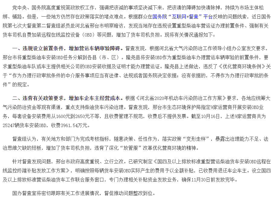 根據《河北省2020年機動車污染防治工作方案》要求,各地應統籌大氣污染防治資金等現有渠道,重點支持柴油貨車污染治理。督查發現,邢臺市生態環境保護局指定9家運營商開展安裝OBD業務,每套設備安裝費用從1600元到2650元不等,且收費管理不規范,收費后不提供發票。截至10月16日,上述9家運營商共為25247輛貨車安裝OBD,收費3961.54萬元。督查組認為,有關地方和部門為完成考核指標,隨意決策、任性作為,落實政策“變形走樣”,暴露出治理能力不足、法治思維欠缺的短板,增加了貨車司機負擔,違背了深化“放管服”改革優化營商環境的精神。針對督查發現問題,邢臺市政府高度重視、立行立改。已研究制定《國四及以上排放標準重型營運柴油貨車安裝OBD遠程在線監控終端補貼發放工作方案》,明確按照每輛貨車安裝OBD實際產生的費用予以全額補貼,已收費用退還車企車主。設立國四及以上排放標準營運柴油貨車工作聯合服務窗口,專門辦理相關補貼資金發放業務,確保11月30前發放完畢。國辦督查室將密切跟蹤有關工作進展情況,督促推動問題整改到位。