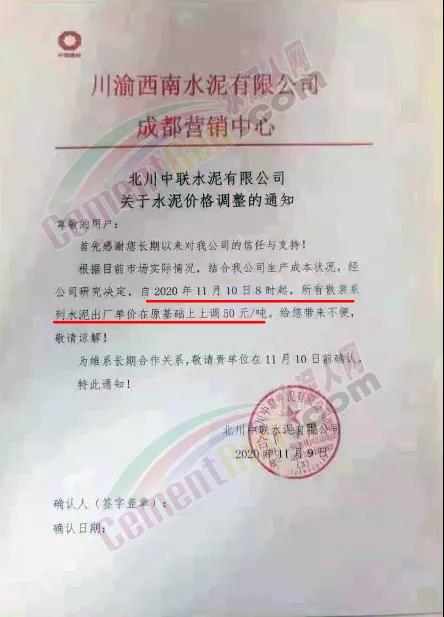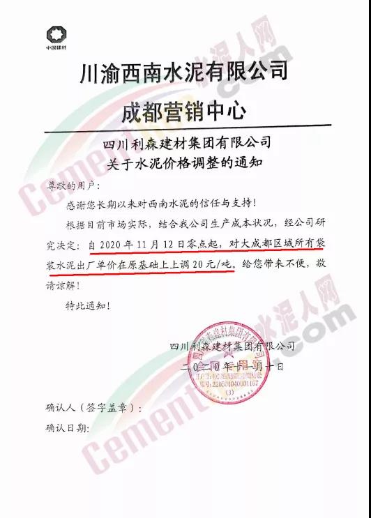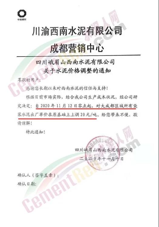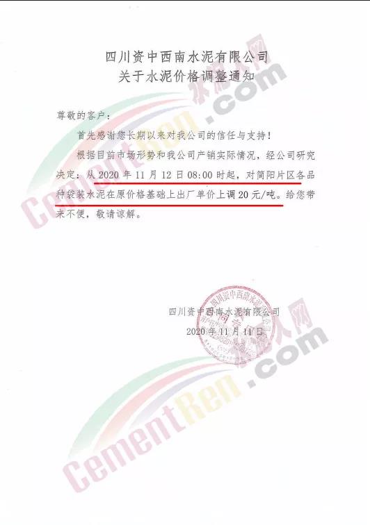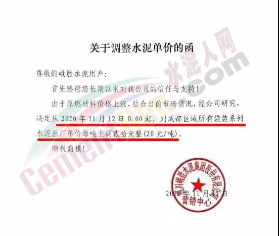 四川峨勝水泥通知自11月12日零時起,對成都區(qū)域所有袋裝水泥上調(diào)20元/噸。