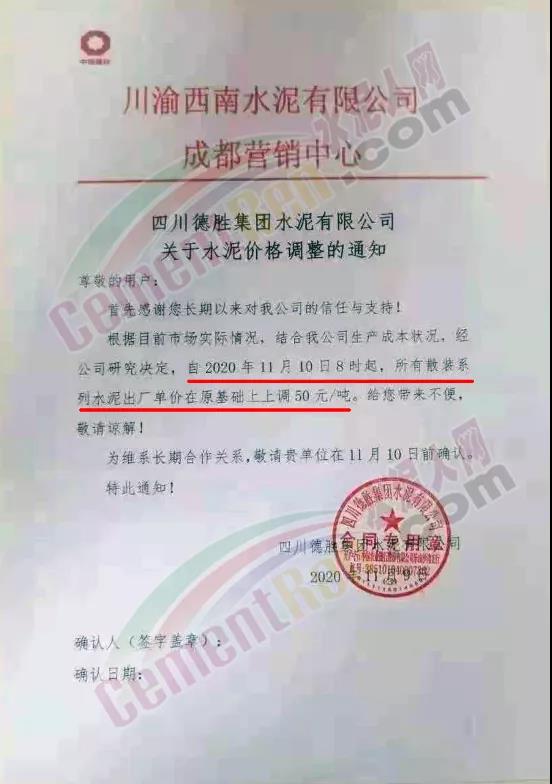 渝西南水泥成都營銷中心德勝集團、綿竹澳東水泥、利森建材集團、北川中聯(lián)水泥、安縣中聯(lián)水泥通知11月10日早8時起起5家工廠散裝水泥出廠價格同步上調(diào)50元/噸 。