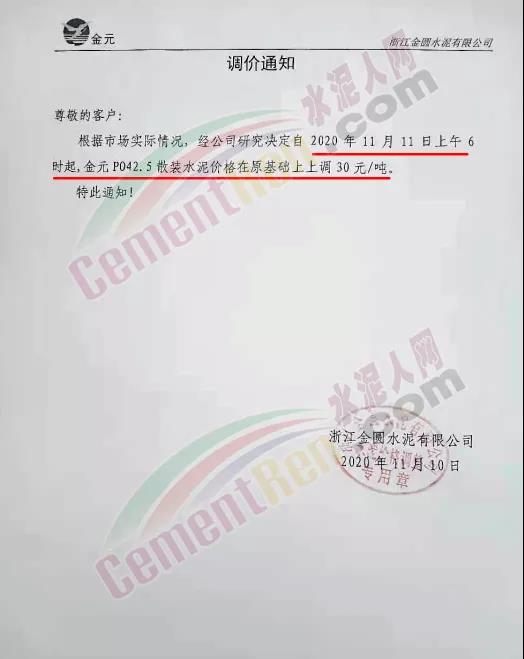 浙江金圓水泥通知11月11日上午6時起,PO42.5散裝水泥 上調(diào)30元/噸。