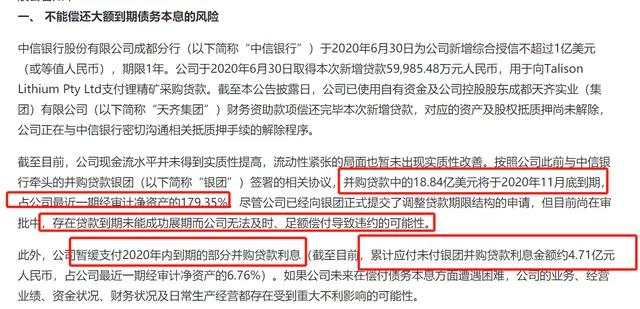 根據(jù)公告,天齊鋰業(yè)的18.84億美元(約合人民幣124.4億元)并購貸款將于2020年11月底到期,存在無法及時、足額償付導(dǎo)致違約的可能性。