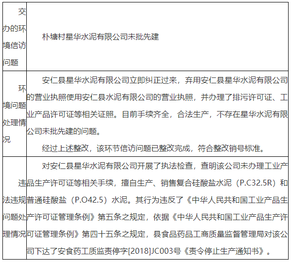 目前手續齊全,合法生產,不存在星華水泥有限公司未批先建的問題。經過上述整改,該環節信訪問題已整改完成,符合整改銷號標準。