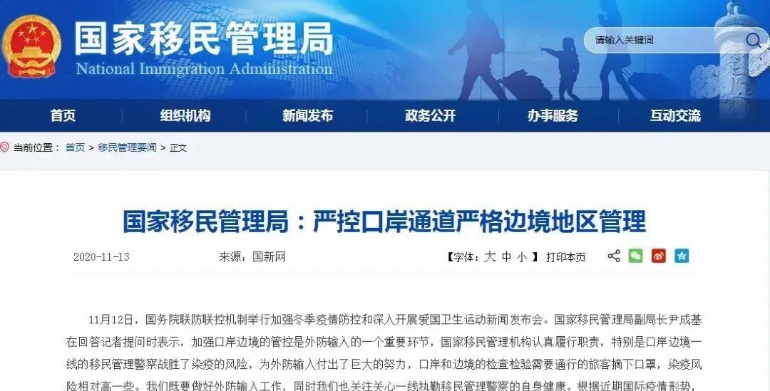 在11月13日,國務院僑務辦公室又轉發了中國國家移民局的一份最新聲明:嚴格控制不必要人員跨境活動。
