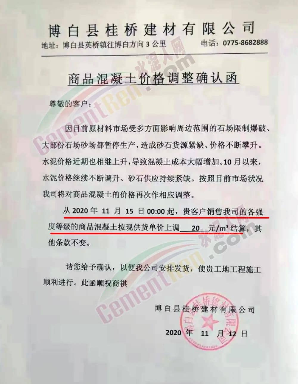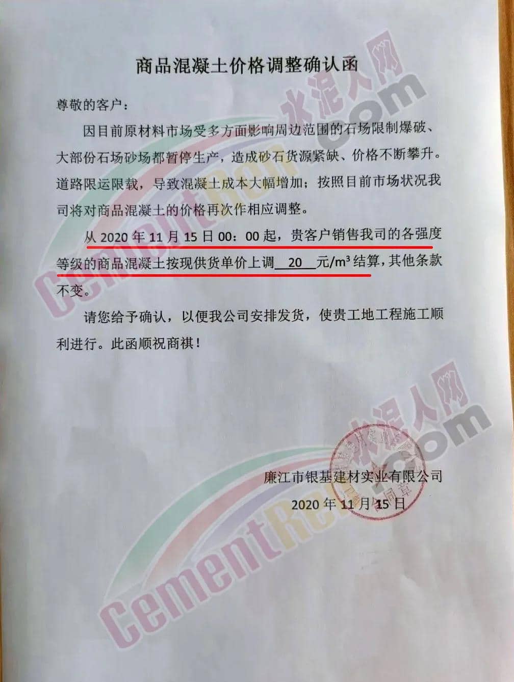 按照目前市場(chǎng)狀況公司將對(duì)商品混凝土的價(jià)格再次作相應(yīng)調(diào)整。從2020年11月15日0時(shí)起,公司各強(qiáng)度等級(jí)的商品混凝土按現(xiàn)供貨單價(jià)上調(diào)20元/立方結(jié)算,其他條款不變。
