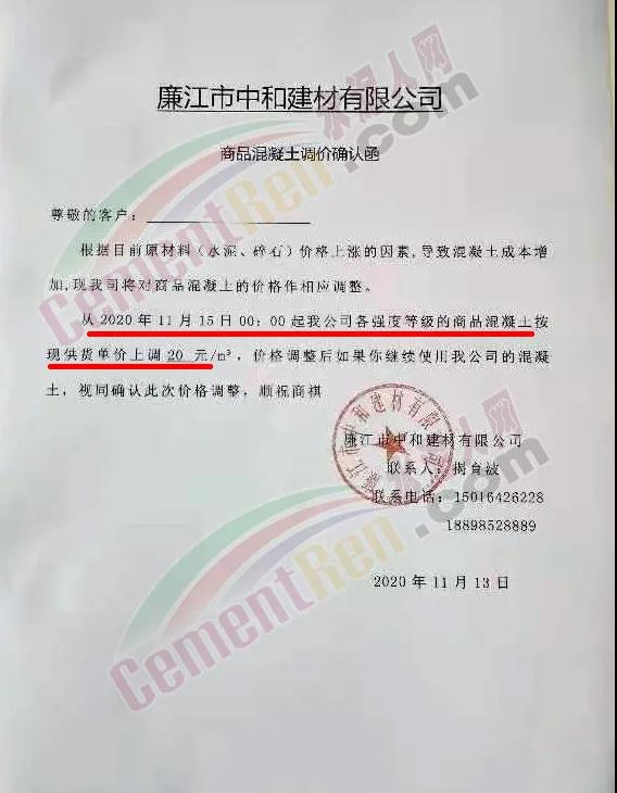 廉江市中和建材有限公司通知,根據(jù)目前原材料(水泥、碎石)價(jià)格上漲的因素,導(dǎo)致混凝土成本增加,公司對(duì)商品混凝土的價(jià)格作相應(yīng)調(diào)整。從2020年11 月15日0時(shí)起我公司各強(qiáng)度等級(jí)的商品混凝土按現(xiàn)供貨單價(jià)上調(diào) 20 元/立方 。