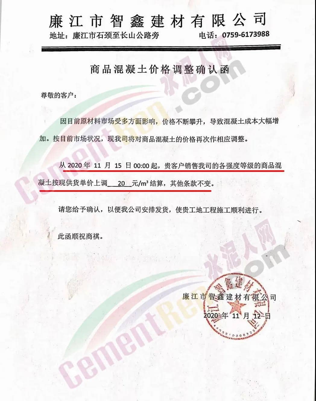 廉江市智鑫建材有限公司通知,因目前原材料市場(chǎng)受多方面影響,價(jià)格不斷攀升,導(dǎo)致混凝土成本大幅增加。按目前市場(chǎng)狀況,公司對(duì)商品混凝土的價(jià)格再次作相應(yīng)調(diào)整。從2020年11月15日0時(shí)起,公司各強(qiáng)度等級(jí)的商品混凝土按現(xiàn)供貨價(jià)格上調(diào)20元/方結(jié)算,其他條款不變。
