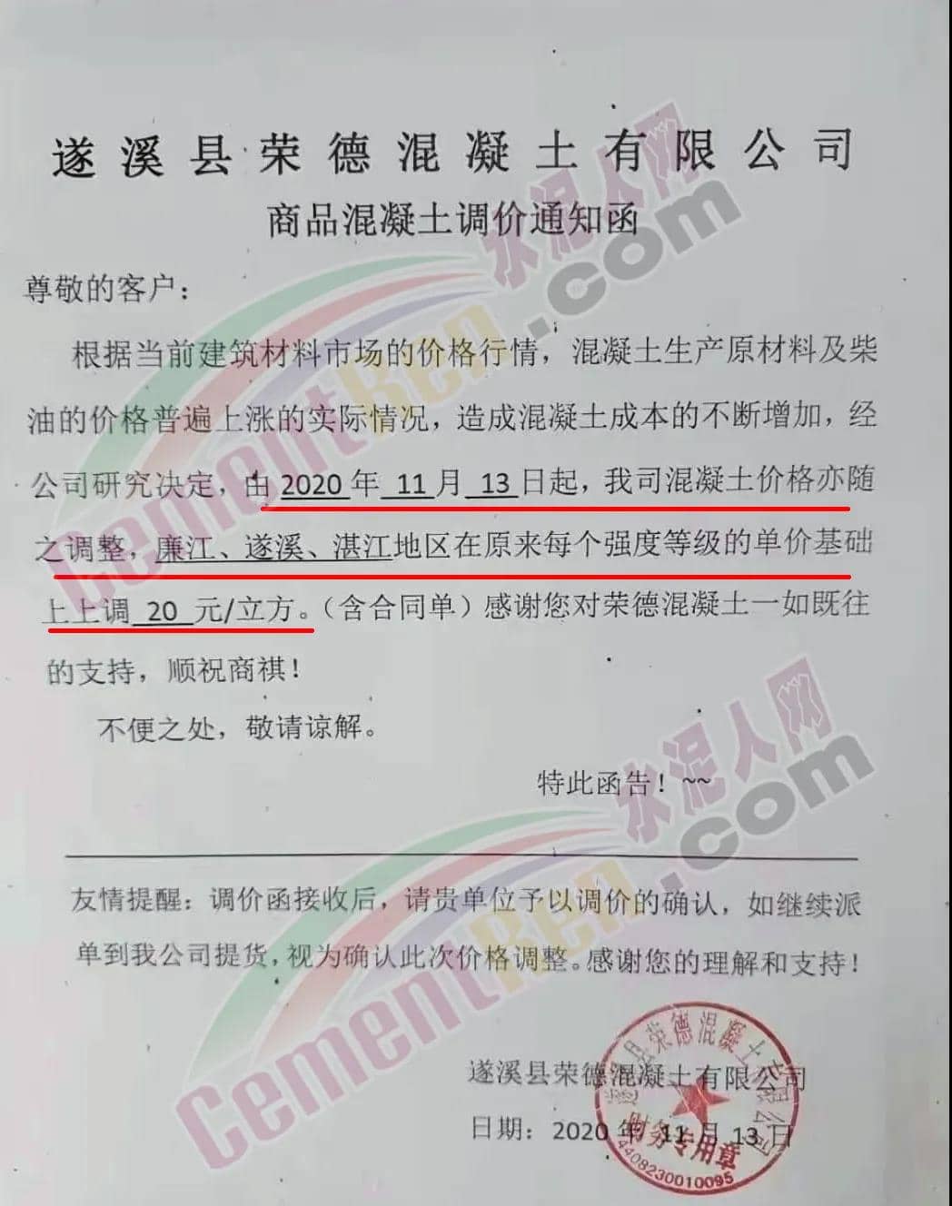 遂溪縣榮德混凝土有限公司商品混凝土調(diào)價(jià)通知稱(chēng),根據(jù)當(dāng)前建筑材料市場(chǎng)的價(jià)格行情,混凝土生產(chǎn)原材料及柴油的價(jià)格普遍上漲的實(shí)際情況,造成混凝土成本的不斷增加。經(jīng)公司研究決定,由2020年11月13日起,混凝土價(jià)格亦隨之調(diào)整,廉江、遂溪、湛江地區(qū)在原來(lái)每個(gè)強(qiáng)度等級(jí)的單價(jià)基礎(chǔ)上上調(diào)20元/立方。