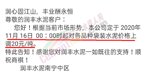 潤(rùn)豐水泥南寧中區(qū)通知根據(jù)當(dāng)前市場(chǎng)形勢(shì),公司定于 2020年11月16日 00∶00時(shí)起對(duì)各品種袋裝水泥價(jià)格上調(diào)20元/噸。