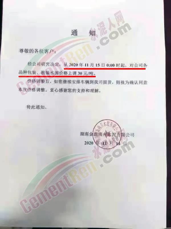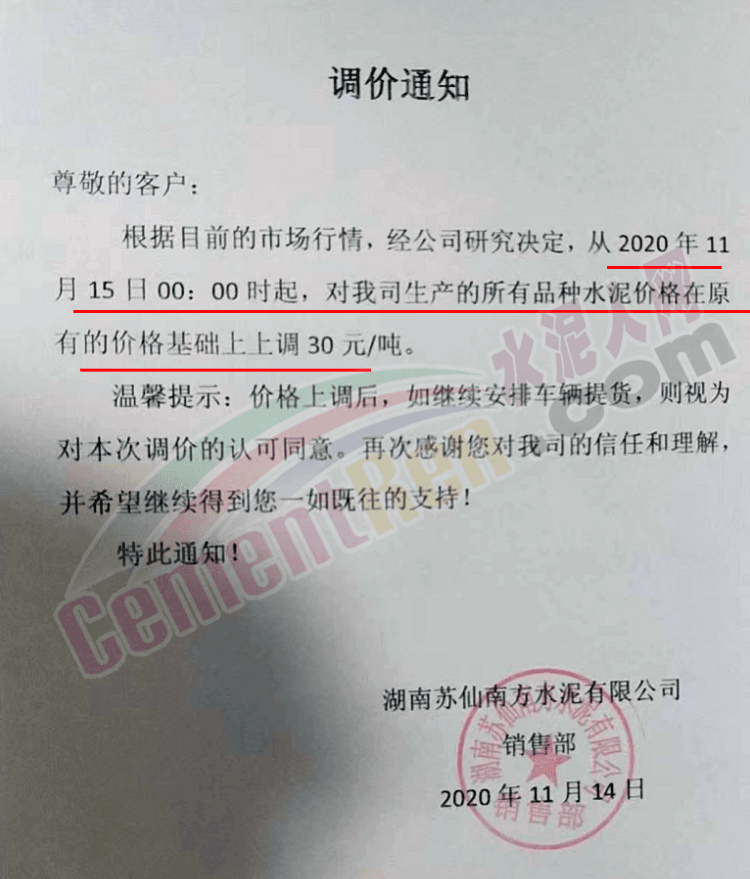 尊敬的客戶:您好!根據(jù)當(dāng)前市場(chǎng)行情,我公司于2020年11月16日8:00時(shí),對(duì)PO42.5級(jí)、M32.5級(jí)袋裝水泥價(jià)格上調(diào)20元/噸,特此通知!