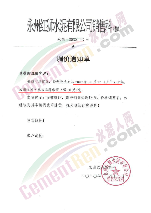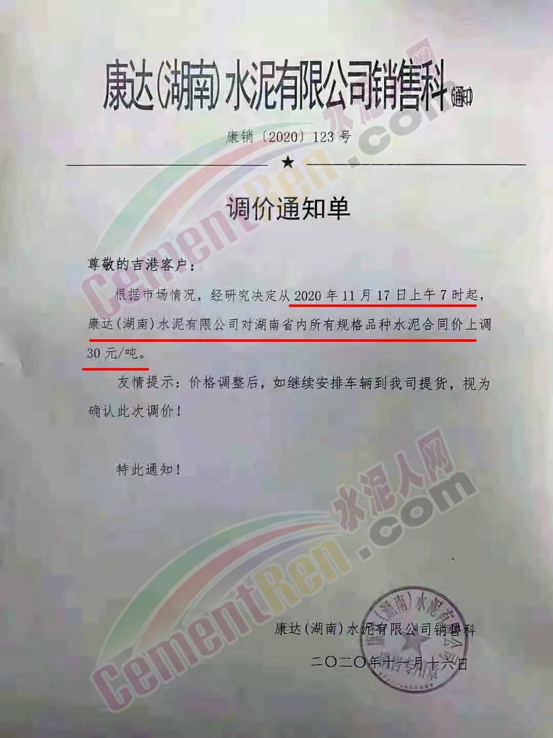紅獅水泥旗下康達(dá)(湖南)水泥有限公司通知11月17日上午7時(shí)起對(duì)湖南省內(nèi)所有規(guī)格品種水泥合格價(jià)上調(diào)30元/噸。