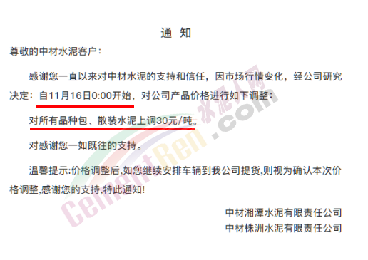 湖南蘇仙南方水泥通知,11月15日0時(shí)起上調(diào)30元/噸。