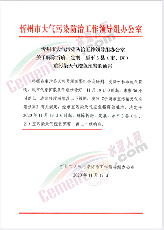 山西忻州市于11月19日0時起,解除忻府、定囊、平原3縣重污染天氣橙色預警,停止二級響應。