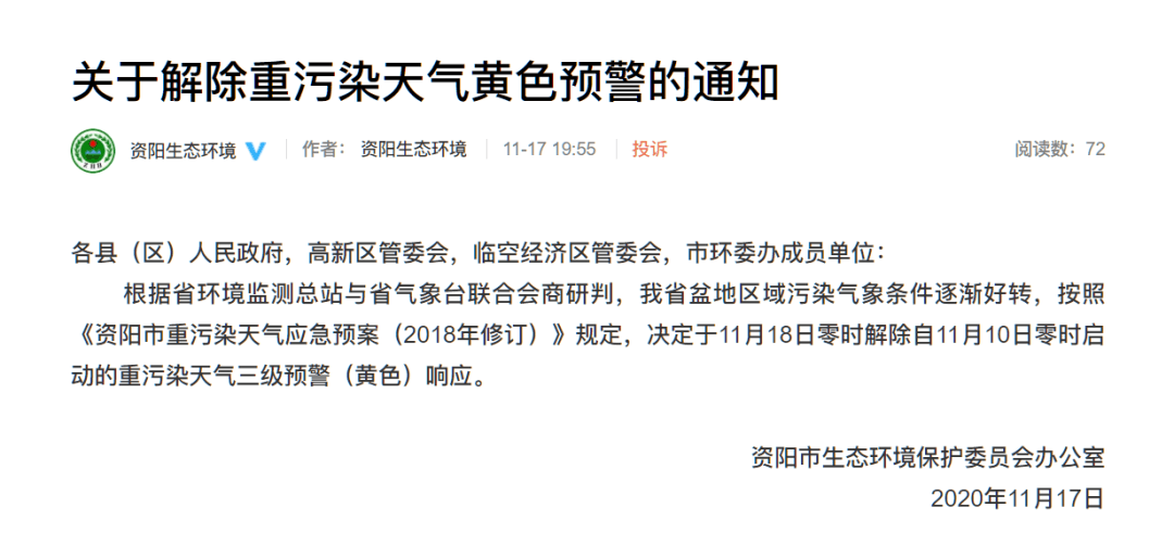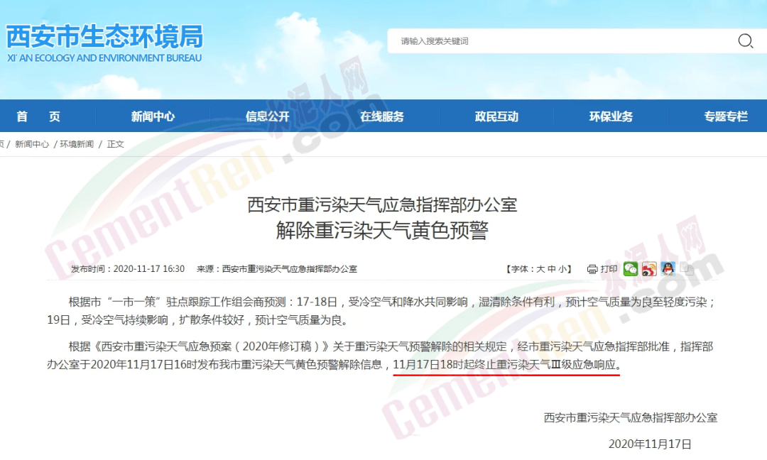 11月17日16時,西安市重污染天氣應急指揮部辦公室發布消息,17-18日,受冷空氣和降水共同影響,濕清除條件有利,預計空氣質量為良至輕度污染。根據相關規定,西安市重污染天氣黃色預警解除,11月17日18時起終止重污染天氣Ⅲ級應急響應。
