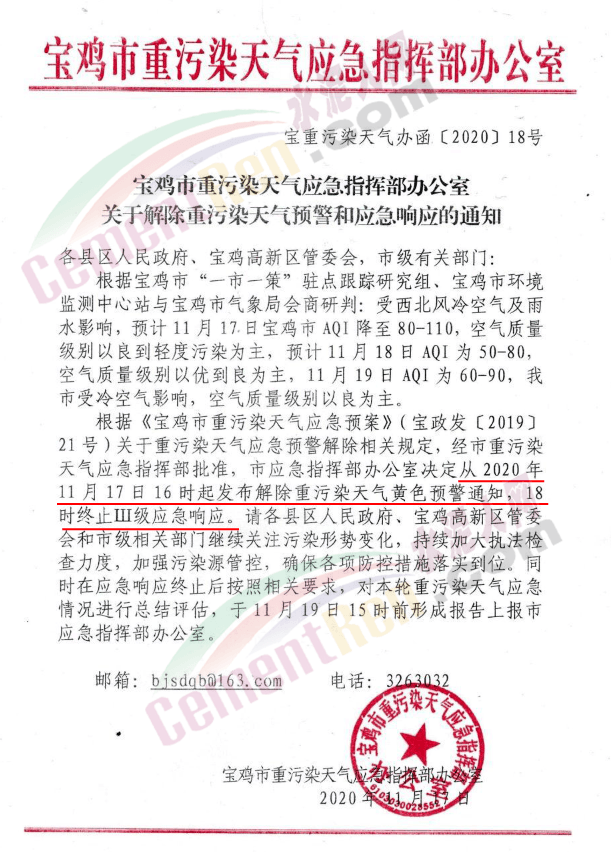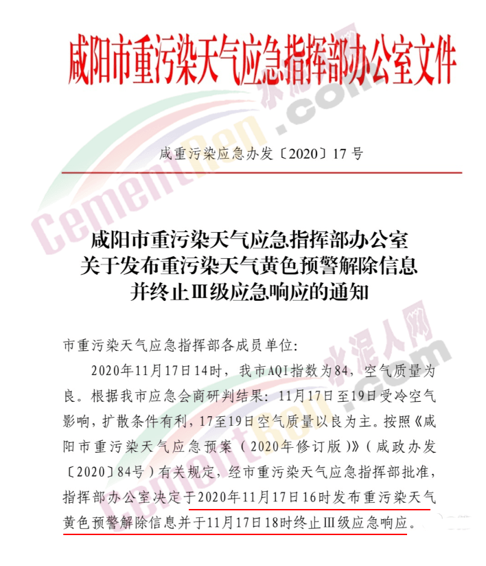 2020年11月17日14時,咸陽市AQI指數為84,空氣質量為良。根據咸陽市應急會商研判結果:11月17日至19日受冷空氣影響,擴散條件有利,17至19日空氣質量以良為主。按照《咸陽市重污染天氣應急預案(2020年修訂版)》(咸政辦發〔2020〕84號)有關規定,經咸陽市重污染天氣應急指揮部批準,指揮部辦公室決定于2020年11月17日16時發布重污染天氣黃色預警解除信息并于11月17日18時終止Ⅲ級應急響應。