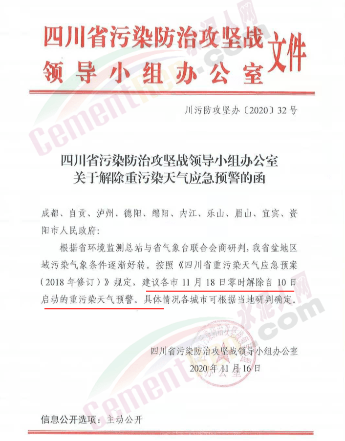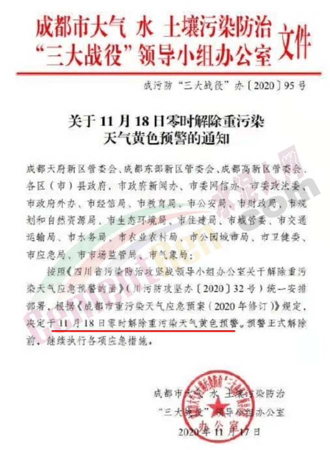 根據四川省環境監測總站與省氣象臺聯合會商研判,我省盆地區域污染氣象條件逐漸好轉,按照《四川省重污染天氣應急預案(2018年修訂)》規定,建議成都、自貢、瀘州、德陽、綿陽、內江、樂山、眉山、宜賓、資陽于11月18日零時解除自10日啟動的重污染天氣黃色預警。具體情況各城市可根據當地形勢研判決定。