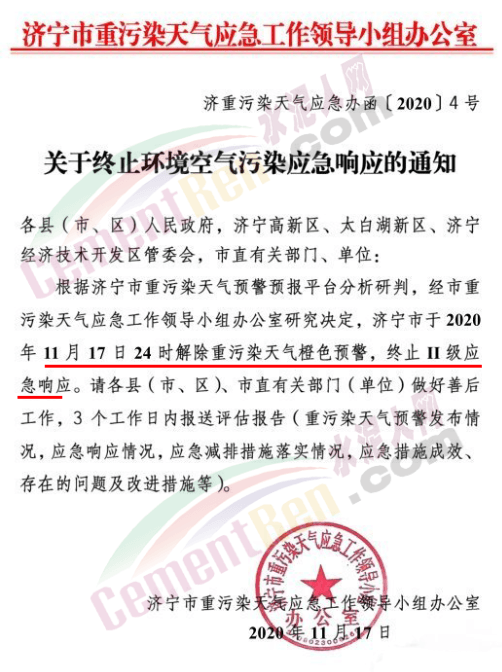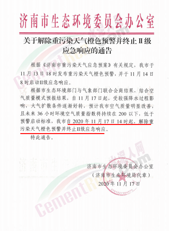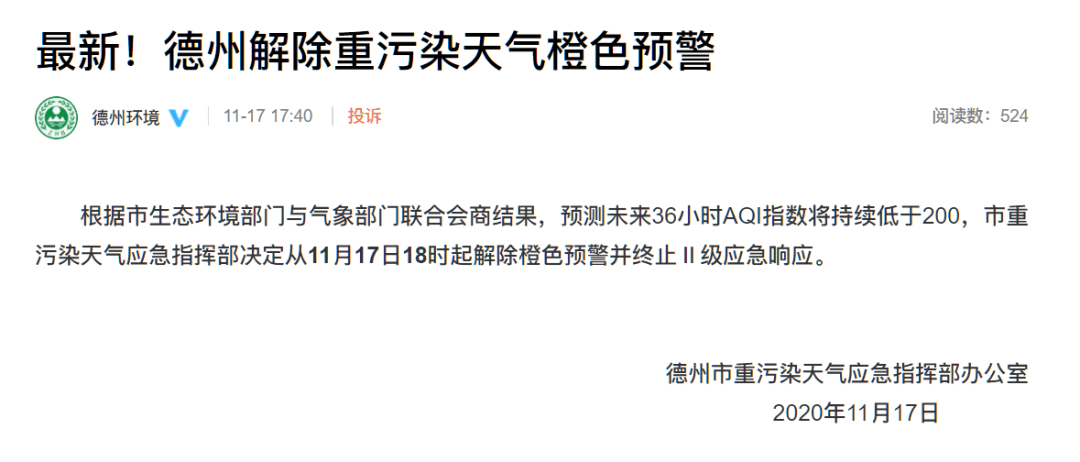 11月17日24時橙警解除!根據濟寧市重污染天氣預警預報平臺分析研判,經市重污染天氣應急工作領導小組辦公室研究決定,濟寧市于2020年11月17日24時解除重污染天氣橙色預警,終止II級應急響應。